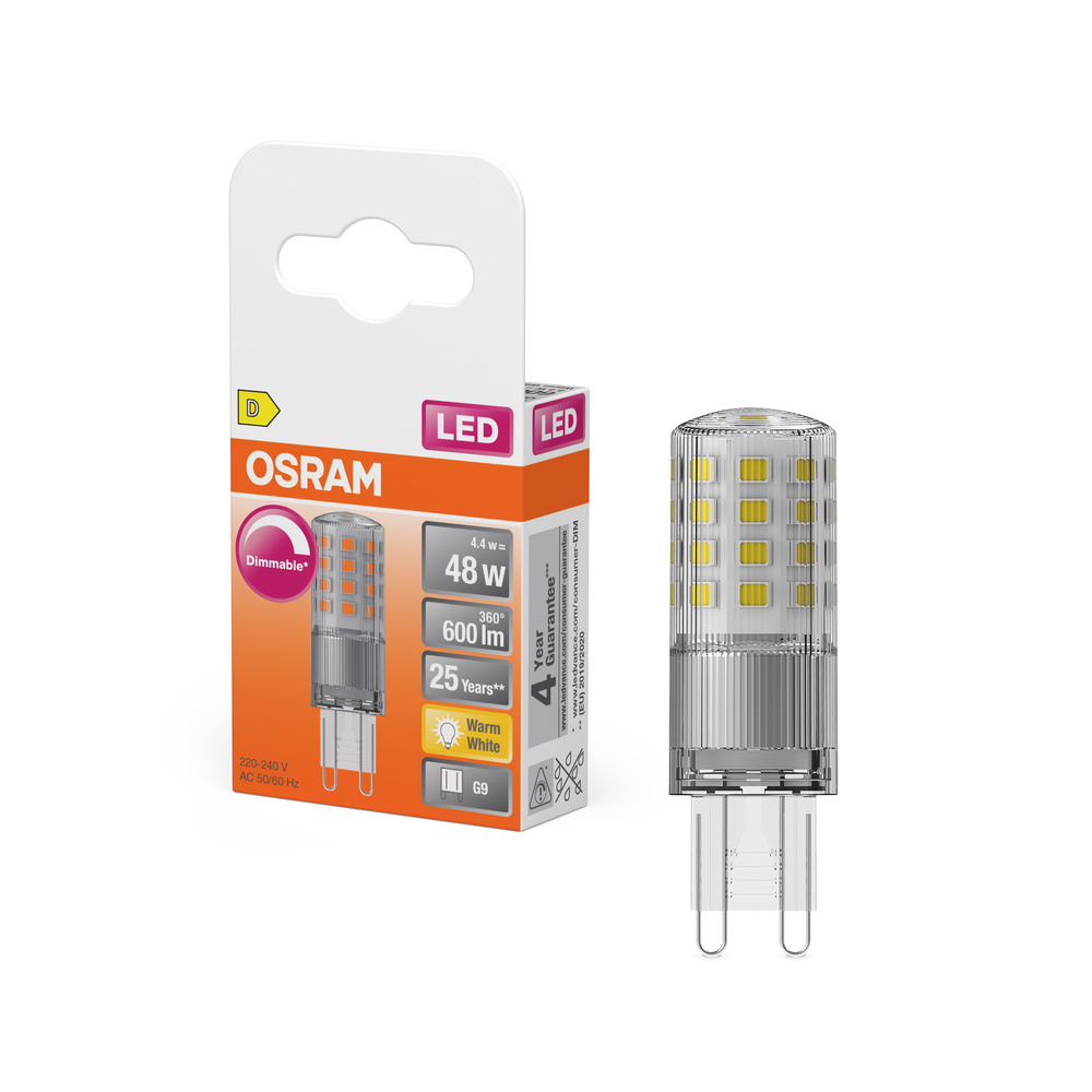 Lampy LED z możliwością ściemniania z trzonkiem G9. Cechy produktu: Ściemnialne (za pomocą licznych popularnych ściemniaczy, zobacz więcej www.ledvance.pl/dim). Zamienniki LED dla konwencjonalnych żarówek wysokonapięciowych. Zalety produktu: Równomierny rozsył światła we wszystkich kierunkach. Długa trwałość do 25 000 godzin. Idealne do zastosowania dekoracyjnego oraz do eksploatacji bez oprawy. 4-letnia gwarancja. Niższe zużycie energii w porównaniu do lamp żarowych lub halogenowych. Obszary zastosowań: Nastrojowe oświetlenie akcentujące w całym domu. Sklepy, hotele i restauracje. Do użytku na zewnątrz tylko w odpowiednich oprawach zewnętrznych. Porady dotyczące bezpieczeństwa: Nie dotykaj lampy, jeśli jest stłuczona.. Nie wolno używać, jeśli zewnętrzne źródło światła jest uszkodzone.. Aby zapewnić pełną wydajność oświetlenia i trwałość produktu, zalecane jest demontaż szyby lub osłony oprawy oświetleniowej..