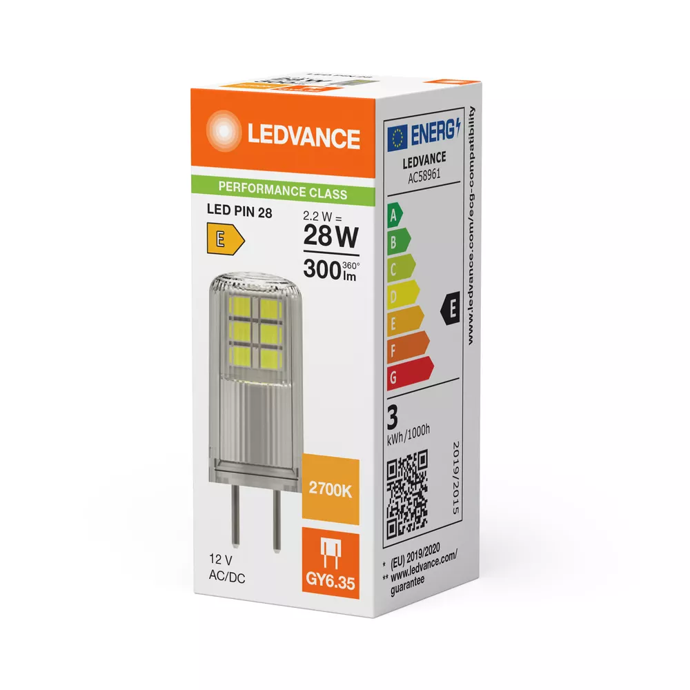 Niskonapięciowe lampy LED 12 V z trzonkiem kołkowym. Cechy produktu: Zgodność z wieloma konwencjonalnymi i elektronicznymi zasilaczami (patrz również <a href="https://www.ledvance.com/low-voltage-ledlamps">compatibility list</a>). Zamiennik LED dla niskonapięciowych żarówek halogenowych. Trzonek: G4, GY6.35. Zalety produktu: Praca alternatywnie z zasilaniem prądem stałym lub przemiennym. Równomierny rozsył światła we wszystkich kierunkach. Idealne do zastosowania dekoracyjnego oraz do eksploatacji bez oprawy. Długa trwałość do 15 000 godzin. 4-letnia gwarancja. Niższe zużycie energii w porównaniu do lamp żarowych lub halogenowych. Obszary zastosowań: Zastosowania dekoracyjne. Nastrojowe oświetlenie akcentujące w całym domu. Sklepy, hotele i restauracje. Do użytku na zewnątrz tylko w odpowiednich oprawach zewnętrznych. Porady dotyczące bezpieczeństwa: Nie dotykaj lampy, jeśli jest stłuczona.. Nie wolno używać, jeśli zewnętrzne źródło światła jest uszkodzone.. Aby zapewnić pełną wydajność oświetlenia i trwałość produktu, zalecane jest demontaż szyby lub osłony oprawy oświetleniowej..