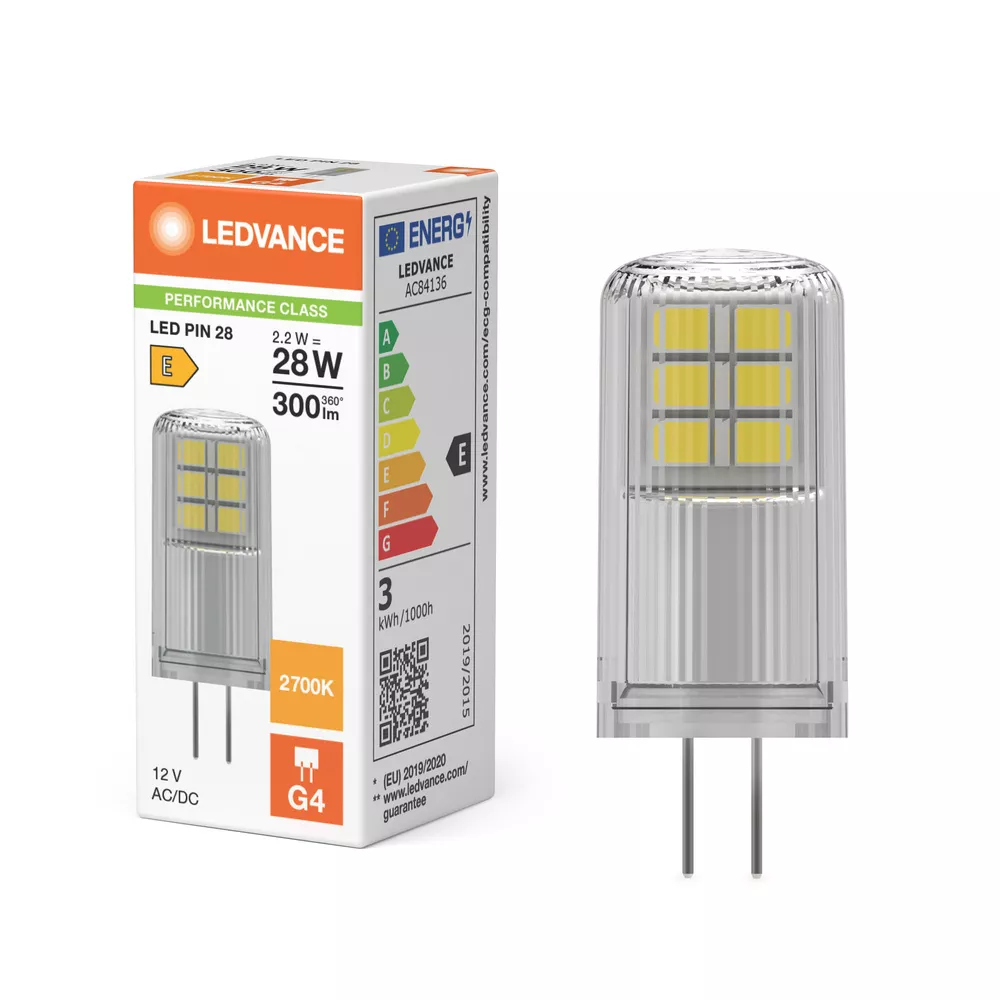 Niskonapięciowe lampy LED 12 V z trzonkiem kołkowym. Cechy produktu: Zgodność z wieloma konwencjonalnymi i elektronicznymi zasilaczami (patrz również compatibility list). Zamiennik LED dla niskonapięciowych żarówek halogenowych. Trzonek: G4, GY6.35. Zalety produktu: Praca alternatywnie z zasilaniem prądem stałym lub przemiennym. Równomierny rozsył światła we wszystkich kierunkach. Idealne do zastosowania dekoracyjnego oraz do eksploatacji bez oprawy. Długa trwałość do 15 000 godzin. 4-letnia gwarancja. Niższe zużycie energii w porównaniu do lamp żarowych lub halogenowych. Obszary zastosowań: Zastosowania dekoracyjne. Nastrojowe oświetlenie akcentujące w całym domu. Sklepy, hotele i restauracje. Do użytku na zewnątrz tylko w odpowiednich oprawach zewnętrznych. Porady dotyczące bezpieczeństwa: Nie dotykaj lampy, jeśli jest stłuczona.. Nie wolno używać, jeśli zewnętrzne źródło światła jest uszkodzone.. Aby zapewnić pełną wydajność oświetlenia i trwałość produktu, zalecane jest demontaż szyby lub osłony oprawy oświetleniowej..
