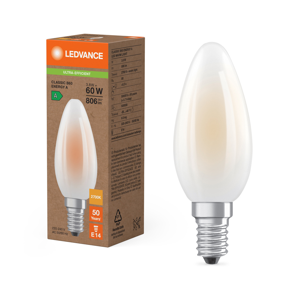 Lampy LED , klasyczny kształt świecy, KLASA O EFEKTYWNOŚCI ENERGETYCZNEJ A. Cechy produktu: Lampy LED dla napięcia sieciowego. Skuteczność świetlna do 210 lm/W. Kąt wiązki światła: do 300°. Długa trwałość do 50 000 godzin. Bardzo duża liczba cykli przełączania 500 000. Zalety produktu: Lampy wyposażone w innowacyjną technologię „włókien” LED. Niskie zużycie energii. Wygląd, wymiary i strumień świetlny porównywalne z żarówkami halogenowymi. Natychmiast 100 % światła, bez czasu nagrzewania. Niskie tętnienie światła. Obszary zastosowań: Doskonałe rozwiązanie do instalacji dekoracyjnych. Zastosowania domowe. Oświetlenie ogólne. Do użytku na zewnątrz tylko w odpowiednich oprawach zewnętrznych. Porady dotyczące bezpieczeństwa: Nie dotykaj lampy, jeśli jest stłuczona.. Nie wolno używać, jeśli zewnętrzne źródło światła jest uszkodzone..