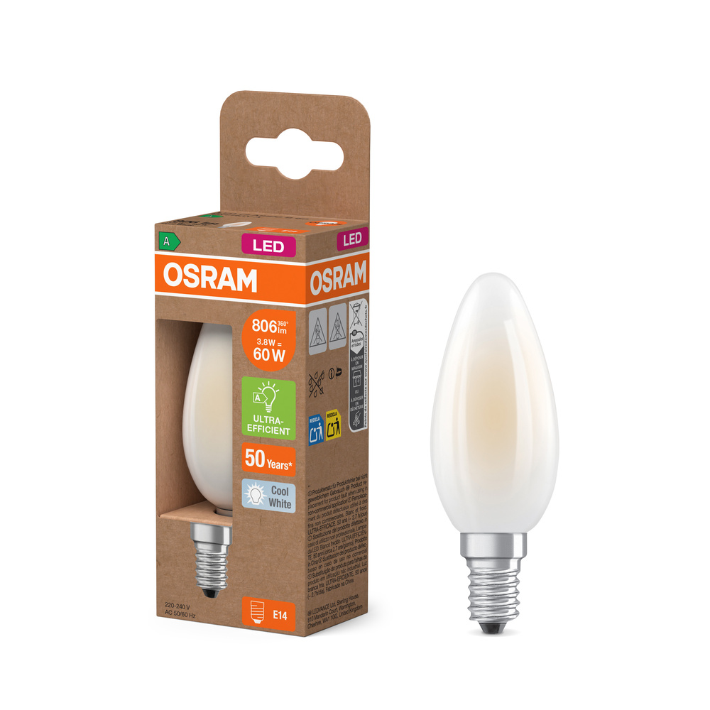 Lampy LED , klasyczny kształt świecy, KLASA O EFEKTYWNOŚCI ENERGETYCZNEJ A. Cechy produktu: Lampy LED dla napięcia sieciowego. Kąt wiązki światła: do 300°. Długa trwałość do 50 000 godzin. Bardzo duża liczba cykli przełączania 500 000. Skuteczność świetlna do 210 lm/W. Zalety produktu: Lampy wyposażone w innowacyjną technologię „włókien” LED. Wygląd, wymiary i strumień świetlny porównywalne z żarówkami halogenowymi. Niskie zużycie energii. Natychmiast 100 % światła, bez czasu nagrzewania. Niskie tętnienie światła. Obszary zastosowań: Doskonałe rozwiązanie do instalacji dekoracyjnych. Zastosowania domowe. Oświetlenie ogólne. Do użytku na zewnątrz tylko w odpowiednich oprawach zewnętrznych. Porady dotyczące bezpieczeństwa: Nie dotykaj lampy, jeśli jest stłuczona.. Nie wolno używać, jeśli zewnętrzne źródło światła jest uszkodzone..