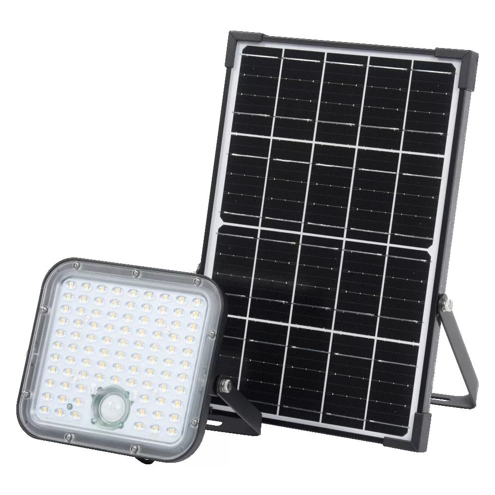 Oprawa zasilana energią słoneczną, podzielona na reflektor i zewnętrzny panel słoneczny połączony przewodem. Cechy produktu: Oprawy oświetleniowe LED do użytku zewnętrznego zasilane energią słoneczną. Czujnik ruchu PIR i czujnik światła. Ładowanie akumulatora poprzez zewnętrzny panel słoneczny. Pilot do zaawansowanych ustawień czujnika. Naświetlacz i panel słoneczny są połączone za pomocą przewodu o długości 5 m. Zalety produktu: Ekologiczna oprawa zasilana energią słoneczną;. Wydajne energetycznie dzięki technologii LED. Naświetlacz można zamontować niezależnie od panelu słonecznego. Obszary zastosowań: Na zewnątrz. Garaże. Elewacje budynków. Domki ogrodowe. Wyposażenie / Akcesoria: Kompletne akcesoria do montażu i podłączenia w zestawie. Przewód połączeniowy o długości 5 m. Pilot w zestawie. Porady dotyczące bezpieczeństwa: Ostrzeżenie dotyczące baterii: Przechowywać poza zasięgiem dzieci. Połknięcie może prowadzić do oparzeń chemicznych, perforacji tkanek miękkich i śmierci. Ciężkie oparzenia mogą wystąpić w ciągu 2 godzin od połknięcia. Natychmiast zasięgnij porady lekarza. . Jeśli komora baterii (jeśli dotyczy) nie zamyka się bezpiecznie, zaprzestań używania produktu i trzymaj go z dala od dzieci. Jeśli podejrzewasz, że baterie mogły zostać połknięte lub umieszczone w jakiejkolwiek części ciała, natychmiast zwróć się o pomoc lekarską.. Prosimy unikać: Maksymalna temperatura otoczenia: +35 °C. Wymiana baterii na nieprawidłowy typ, który może obejść zabezpieczenie (na przykład w przypadku niektórych typów baterii litowych). Wysokość podczas pracy: 2000 m. Utylizacja baterii w ogniu lub gorącym piekarniku, lub mechaniczne zgniatanie lub cięcie baterii, co może spowodować wybuch..