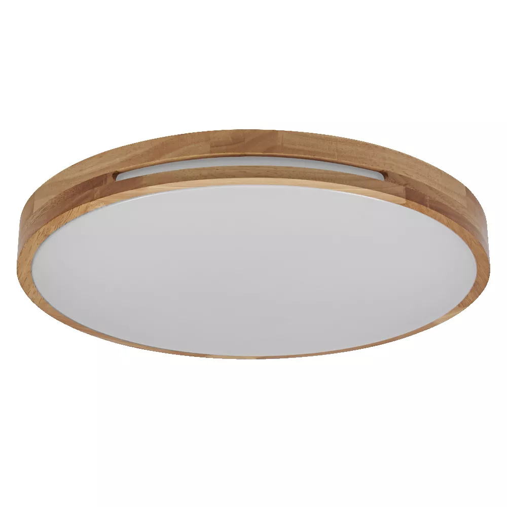 luminaire sufitowa LED z drewnianym pierścieniem. Cechy produktu: Stopień ochrony: IP20. Trwałość: do 30 000 h. Wersja z możliwością ściemniania: ściemnianie trzypoziomowe przełączane poprzez wielokrotne przełączanie. Temperatura barwowa: 3000 K (Warm White - ciepłobiała). Materiał obudowy: tworzywo sztuczne i drewno. Zalety produktu: Stylowy i nowoczesny wygląd. Łatwy montaż i użycie. Dłuższa trwałość dzięki technologii LED. Obszary zastosowań: Oprawy do użytku wewnętrznego. Pomieszczenia prywatne (pokoje dzienne, jadalnie, sypialnie itp.). Wyposażenie / Akcesoria: Śruby i kołki montażowe dostarczone w zestawie. Porady dotyczące bezpieczeństwa: Podczas przeprowadzania instalacji i czynności serwisowych oraz zdejmowania klosza oprawę oświetleniową należy odłączyć od zasilania. Sprawdź przydatność ściany i sufitu. Jeśli nie jesteś pewien, zasięgnij profesjonalnej porady.. Produkt w klasie ochrony I. Wszystkie przewodzące prąd, metalowe części obudowy, które mogą absorbować napięcie podczas pracy lub podczas konserwacji w przypadku awarii, muszą być stale PODŁĄCZONE do przewodu uziemiającego.. Wszystkie podłączenia elektryczne muszą być wykonane przez osobę wykwalifikowaną.. Uwaga, ryzyko porażenia prądem..