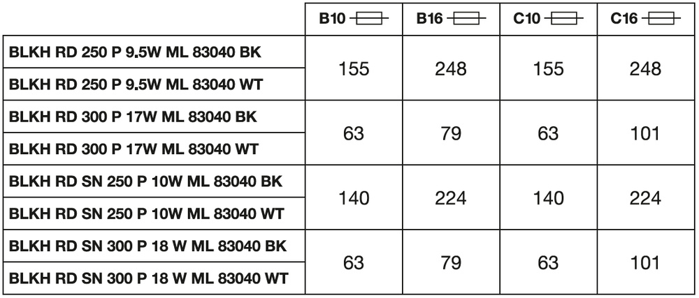| Maks. liczba opraw na wyłącznik nadprądowy B16: | 79 |
