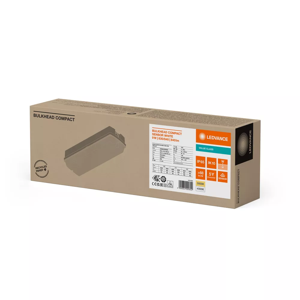 Solidna oprawa ścienna i sufitowa o stopniu ochrony IP65 z czujnikiem HF. Cechy produktu: Czujnik o wysokiej częstotliwości do wykrywania światła i ruchu. Obudowa i klosz wykonane z poliwęglanu (PC) odpornego na promieniowanie UV. Stopień ochrony: IP65. Odporność na uderzenia: IK10. Strumień świetlny: do 840 lm. Trwałość (L70/B50): do 50 tys. godzin (przy 25°C). Temperatura otoczenia podczas pracy: -20…+45 °C. Zacisk przewodu dla połączenia bez użycia narzędzi. Możliwość wykorzystania wewnętrznego okablowania. Zalety produktu: Wszechstronny dzięki możliwości wyboru CCT w 3000K i 4000K. Wysoce wszechstronny dzięki wybieranym stopniom mocy (Power Select - PS) na sterowniku. Wiele regulacji zasięgu czujnika światła i czasu jego działania. Odpowiednie do wykorzystania w zapylonych i wilgotnych miejscach dzięki wysokiemu stopniowi ochrony IP. Nadaje się do użytku w miejscach publicznych dzięki wysokiej wartości IK. Wiele wzorów montażowych dla wygodnej instalacji. Obszary zastosowań: Bezpośredni zamiennik świetlówkowych opraw oświetleniowych. Korytarze, klatki schodowe i wejścia. Korytarze, przejścia podziemne. Strefy publiczne. Wyposażenie / Akcesoria: Śruby i kołki montażowe dostarczone w zestawie. W zestawie śruba antykradzieżowa.