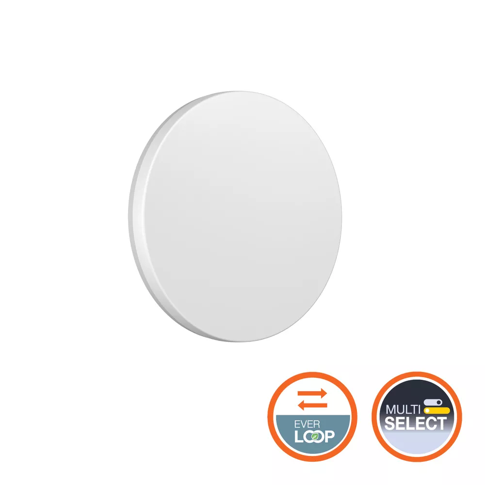 Uniwersalna, okrągła oprawa ścienna i sufitowa ze zintegrowanym luminaire. Cechy produktu: Czujnik wysokiej częstotliwości do wykrywania światła dziennego i ruchu, funkcji korytarzowej i grupowej. Rodzaj ochrony: IP54 (ściana i sufit). Odporność na uderzenia: IK08. Żywotność (L80/B10): 100 000 h (przy 25°C), (L90/B10): 50 000 h (przy 25°C). Obudowa z poliwęglanu (PC), dyfuzor z PC. Temperatura otoczenia podczas pracy: -20…+45 °C. Próba rozżarzonym drutem zgodna z normą IEC 60695-2-12: 850 °C. 5-biegunowa listwa zaciskowa, przekrój przewodu do 5 x 2,5 mm². Możliwość wykorzystania wewnętrznego okablowania. Tylko do użytku wewnętrznego nie nadaje się do zastosowania na zewnątrz. Zalety produktu: Wiele ustawień zasięgu czujnika, wykrywania światła dziennego, czasu podtrzymania i poziomu/okresu DIM za pomocą przełączników DIP. Bezprzewodowa (radiowa) komunikacja z innymi oprawami czujnikowymi w odległości do 15 m. Przypisanie do 15 grup i interakcja między grupami (funkcja lidera/podążającego lub roju). Łatwa rozbudowa źródła światła, sterownika i czujnika (konstrukcja EVERLOOP). Wysoka wszechstronność dzięki możliwości wyboru stopni CCT i mocy (Multi Color / Multi Lumen) w sterowniku. Oprawa wewnętrzna o wysokiej skuteczności świetlnej do 140 lm/W. Wysoka jednorodność barw dzięki SDCM 3. Beznarzędziowe podłączenie elektryczne za pomocą złączy wtykowych. Bardzo jednorodne światło z lekkim efektem podświetlenia. Dla wygodnej konfiguracji czujnik można zdjąć z oprawy. 5-letnia gwarancja. Obszary zastosowań: Bezpośredni zamiennik opraw nastropowych ze zintegrowanymi świetlówkami CFLni. Korytarze. Schody. Łazienki. Hole. Wyposażenie / Akcesoria: Oprawa EVERLOOP: dostępne aktualizacje i zamienniki. Ozdobna srebrna ramka dostępna osobno.