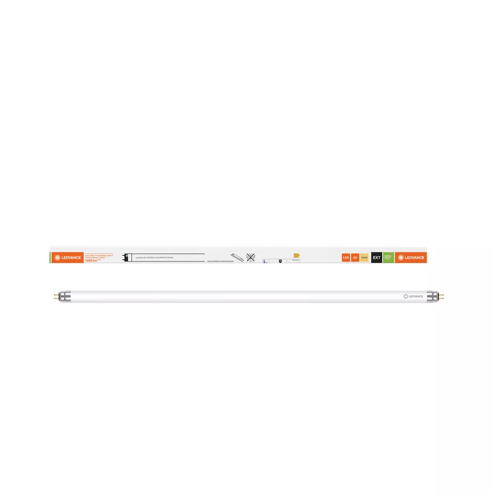 LED TUBE T5 EXTERNAL do LED DRIVER EXTERNAL. Cechy produktu: Przeznaczony do zasilania tylko z LED DRIVER LED TUBE EXTERNAL DALI. Tuba LED wykonana ze szkła z zabezpieczeniem przed odpryskami. Jakość ściemniania 1…100 %. Wysoka odporność na liczbę włączań. Nadaje się do temperatur otoczenia od -20…+50°C. Zalety produktu: Prosta aktualizacja do ściemnialnego systemu LED. Ochrona przed odpryskami dzięki specjalnej powłoce PET. Lampa nie ugina się dzięki rurce wykonanej ze szkła. 5-letnia gwarancja. Obszary zastosowań: Oświetlenie przemysłowe (np. zakładów przemysłowych, centr zaopatrzenia, magazynów). Oświetlenie liniowe do pomieszczeń biurowych, edukacyjnych, magazynowych i handlowych. Sklepy, supermarkety. Porady dotyczące bezpieczeństwa: Możliwa praca w zastosowaniach zewnętrznych w odpowiednich oprawach odpornych na wilgoć zgodnie z kartą katalogową i instrukcją instalacji.. Zakres temperatur pracy tub LED jest ograniczony. W przypadku wątpliwości, należy zmierzyć temperaturę w punkcie Tc oznaczonym na lampie w celu weryfikacji.. LED TUBE T5 EXTERNAL HO80 nie współpracuje ze sterownikiem 2-kanałowym.. Wszystkie podłączenia elektryczne muszą być wykonane przez osobę wykwalifikowaną.. Przed instalacją należy odłączyć zasilanie..
