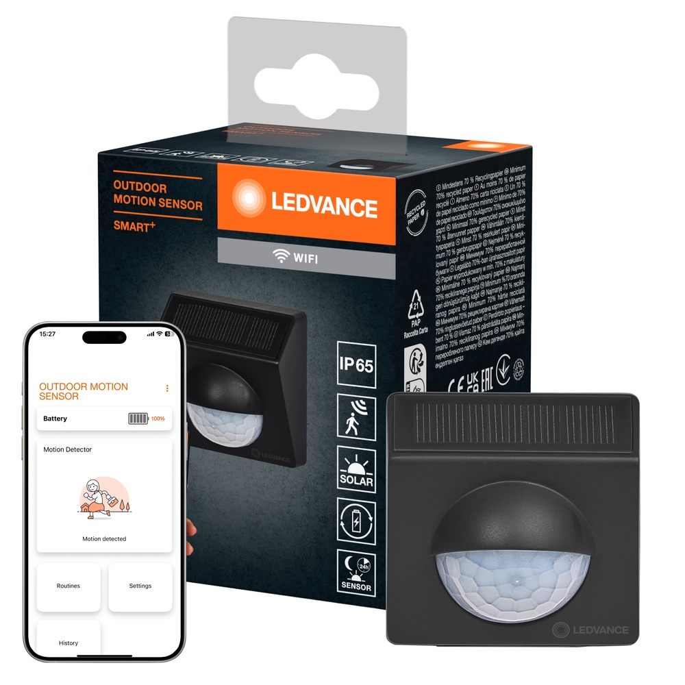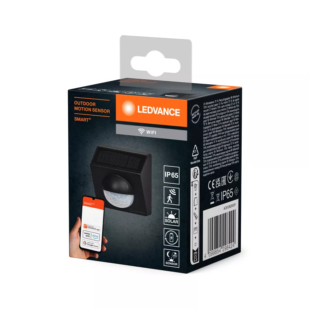 Czujnik zewnętrzny SMART+ wykrywający ruch z technologią WiFi i ogniwem słonecznym. Cechy produktu: Kompatybilny z Amazon Alexa i Google Home. Bezprzewodowy inteligentny czujnik ruchu PIR do wykrywania ruchu w odległości do 9 metrów. Prosty i elastyczny montaż dzięki dwóm wspornikom montażowym do wyboru, montażu na ścianach, w narożnikach, na krawędziach i na przedmiotach za pomocą opasek kablowych. Zintegrowane ogniwo fotowoltaiczne i akumulator zapewniają długą trwałość baterii (-12 miesięcy czasu pracy na jednym ładowaniu przy 10 detekcjach dziennie). Czujnik światła umożliwia automatyzację oświetlenia w zależności od dostępnego oświetlenia otoczenia w 3 trybach (tryb dzienny, nocny i całodniowy). Protokół sieciowy: Wi-Fi (2,4 GHz). Możliwość sterowania za pomocą aplikacji SMART+ (z systemem Android w wersji 8.0 lub iOS w wersji 14.0). Sprawdź poziom naładowania baterii za pomocą aplikacji SMART+ WiFi. Zalety produktu: Łatwa kontrola i automatyzacja kompatybilnych produktów SMART+ WiFi w oparciu o wykryte ruchy. Powiadomienie o wykrytym ruchu. Monitoruje historię detekcji ruchu. Nadaje się do użytku na zewnątrz, stopień ochrony IP65 przed strumieniami wody. Obszary zastosowań: Inteligentny dom na zewnątrz. Ogrody, balkony oraz inne miejsca na zewnątrz budynków. Wyposażenie / Akcesoria: Zintegrowany akumulator i łatwe ładowanie przez USB-C. Przewód do ładowania USB-C nie jest dołączony. Do sterowania za pomocą aplikacji SMART+ wymagany jest smartfon lub tablet (z systemem Android minimum 8.0 lub iOS 14.0). Porady dotyczące bezpieczeństwa: Jeśli komora baterii (jeśli dotyczy) nie zamyka się bezpiecznie, zaprzestań używania produktu i trzymaj go z dala od dzieci. Jeśli podejrzewasz, że baterie mogły zostać połknięte lub umieszczone w jakiejkolwiek części ciała, natychmiast zwróć się o pomoc lekarską.. Prosimy unikać: Maksymalna temperatura otoczenia: +35 °C. Wymiana baterii na nieprawidłowy typ, który może obejść zabezpieczenie (na przykład w przypadku niektórych typów baterii litowych). Wysokość podczas pracy: 2000 m. Utylizacja baterii w ogniu lub gorącym piekarniku, lub mechaniczne zgniatanie lub cięcie baterii, co może spowodować wybuch..