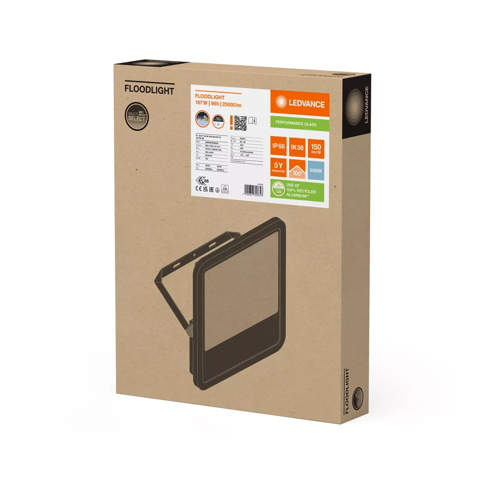 Uniwersalny naświetlacz o strumieniu świetlnym do 25000 lm. Cechy produktu: Wysoka skuteczność świetlna: do 150 lm/W. Stopień ochrony: IP66. Fabrycznie zainstalowany, elastyczny przewód o długości 1 m (H05RN-F), 3 x 1,0 mm². Odbłyśnik, symetryczny rozsył światła z kątem rozsyłu 100° x 100°. Zaciski montażowe z kątem 30° i szerokim obszarem obrotu. Zalety produktu: Zawór odpowietrzający optymalizujący wymianę powietrza, bez uszczerbku dla stopnia ochrony IP. Wysoka wszechstronność dzięki wybieranym stopniom mocy (Multi Lumen) na obudowie. Solidna dławnica kablowa ze zintegrowaną funkcją bariery wodnej. Bezpieczne i bardzo równomierne oświetlenie dzięki wykonanemu ze szkła hartowanego matowemu kloszowi. Jasna, odporna i trwała. Oszczędność energii aż do 90% (w porównaniu z naświetlaczami z lampami halogenowymi). Brak górnego współczynnika rozsyłu światła (ULOR 0%) w przypadku zamontowania pod kątem 0°. Obszary zastosowań: Zamiennik naświetlaczy do żarówek halogenowych. Zastosowania zewnętrzne (IP66). Konstrukcja zgodna z normą EN 60598-2-24 dotyczącą zagrożenia pożarowego, np. poprzez nagromadzenie pyłów. Strefy publiczne. Elewacje budynków. Tereny budowy. Parking. Porady dotyczące bezpieczeństwa: Maks. powierzchnia obciążenia wiatrem 0,105 m².