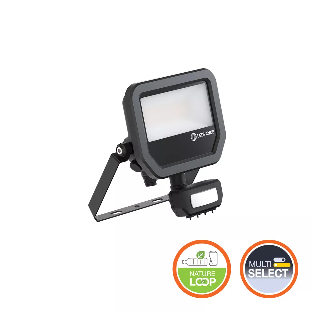 Naświetlacz z elastycznym czujnikiem ruchu i światła dziennego, do 2400 lm. Cechy produktu: Uniwersalny czujnik ruchu i światła. Czujnik z możliwością obrotu w zakresie 350° i pochylenia o 200°. Wysoka skuteczność świetlna: do 145 lm/W. Stopień ochrony: IP65. Fabrycznie zainstalowany, elastyczny przewód o długości 1 m (H05RN-F), 3 x 1,0 mm². Odbłyśnik, symetryczny rozsył światła z kątem rozsyłu 100° x 100°. Zaciski montażowe z kątem 30° i szerokim obszarem obrotu. Zintegrowany zasilacz napięciowy, odpowiedni do 220 - 240 V AC. Zalety produktu: Wymaganie zoptymalizowanego oświetlenia spełnione dzięki uniwersalnemu i programowalnemu czujnikowi. Łatwa regulacja zasięgu czujnika, detekcji światła, czasu podtrzymania i funkcji ściemniania. Możliwość wyłączenia działania czujnika, poprzez wykonanie odpowiedniej sekwencji włączania i wyłączania zasilania oprawy. Zawór odpowietrzający optymalizujący wymianę powietrza, bez uszczerbku dla stopnia ochrony IP. Wysoka wszechstronność dzięki wybieranym stopniom mocy (Multi Lumen) na obudowie. Solidna dławnica kablowa ze zintegrowaną funkcją bariery wodnej. Bezpieczne i bardzo równomierne oświetlenie dzięki wykonanemu ze szkła hartowanego matowemu kloszowi. Jasna, odporna i trwała. Oszczędność energii aż do 90% (w porównaniu z naświetlaczami z lampami halogenowymi). Brak górnego współczynnika rozsyłu światła (ULOR 0%) w przypadku zamontowania pod kątem 0°. Obszary zastosowań: Zamiennik naświetlaczy do żarówek halogenowych. Zastosowanie na zewnątrz (IP65). Konstrukcja zgodna z normą EN 60598-2-24 dotyczącą zagrożenia pożarowego, np. poprzez nagromadzenie pyłów. Strefy publiczne. Elewacje budynków. Tereny budowy. Parking. Ogrody i balkony. Porady dotyczące bezpieczeństwa: Maks. powierzchnia obciążenia wiatrem 0,017 m².