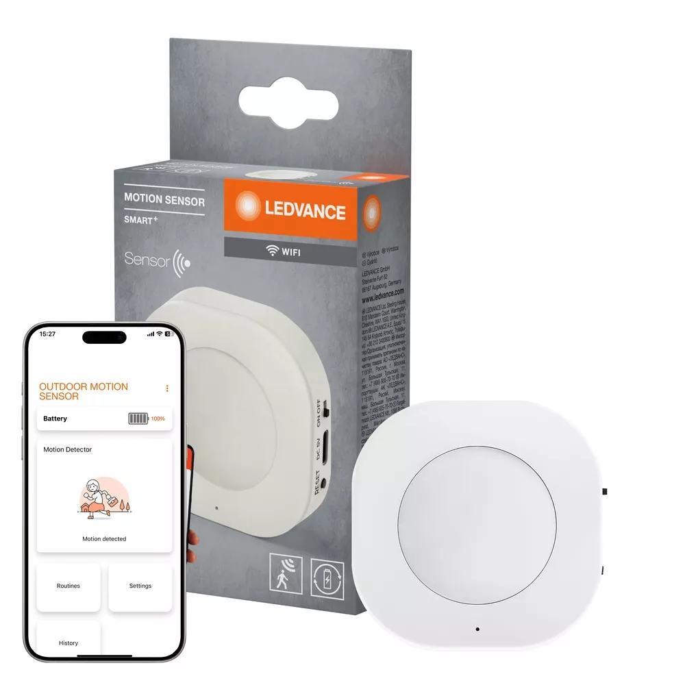 Czujnik SMART+ wykrywający ruch z technologią WiFi. Cechy produktu: Kompatybilny z Amazon Alexa i Google Home. Bezprzewodowy inteligentny czujnik ruchu PIR do wykrywania ruchu na odległość do 5 metrów. Prosty i elastyczny montaż z możliwością wyboru między taśmą samoprzylepną a śrubami. Akumulator o zwiększonej trwałości (8 miesięcy pracy na jednym ładowaniu przy 10 detekcjach dziennie). Produkt może być opcjonalnie zasilany stałym zasilaniem stacjonarnym poprzez USB-C. Protokół sieciowy: Wi-Fi (2,4 GHz). Możliwość sterowania za pomocą aplikacji SMART+ (z systemem Android w wersji 8.0 lub iOS w wersji 14.0). Sprawdź poziom naładowania baterii za pomocą aplikacji SMART+ WiFi. Zalety produktu: Łatwa kontrola i automatyzacja kompatybilnych produktów SMART+ WiFi w oparciu o wykryte ruchy. Powiadomienie o wykrytym ruchu. Monitoruje historię detekcji ruchu. Obszary zastosowań: Inteligentny dom w oświetleniu wewnętrznym i zewnętrznym. Wszędzie tam, gdzie inteligentne sterowanie i automatyka mają zostać wdrożone w kompatybilnych systemach inteligentnego domu. Wyposażenie / Akcesoria: Zintegrowany akumulator i łatwe ładowanie przez USB-C. Przewód do ładowania USB-C nie jest dołączony. Do sterowania za pomocą aplikacji SMART+ wymagany jest smartfon lub tablet (z systemem Android minimum 8.0 lub iOS 14.0). Porady dotyczące bezpieczeństwa: Jeśli komora baterii (jeśli dotyczy) nie zamyka się bezpiecznie, zaprzestań używania produktu i trzymaj go z dala od dzieci. Jeśli podejrzewasz, że baterie mogły zostać połknięte lub umieszczone w jakiejkolwiek części ciała, natychmiast zwróć się o pomoc lekarską.. Prosimy unikać: Maksymalna temperatura otoczenia: +35 °C. Wymiana baterii na nieprawidłowy typ, który może obejść zabezpieczenie (na przykład w przypadku niektórych typów baterii litowych). Wysokość podczas pracy: 2000 m. Utylizacja baterii w ogniu lub gorącym piekarniku, lub mechaniczne zgniatanie lub cięcie baterii, co może spowodować wybuch.. Sprawdź przydatność ściany i sufitu. Jeśli nie jesteś pewien, zasięgnij profesjonalnej porady..