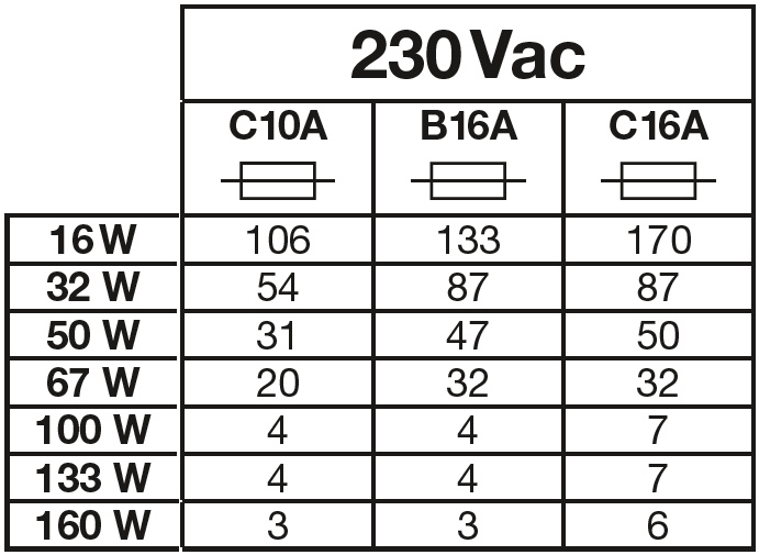 | Maks. liczba opraw na wyłącznik nadprądowy B16: | 133 |
