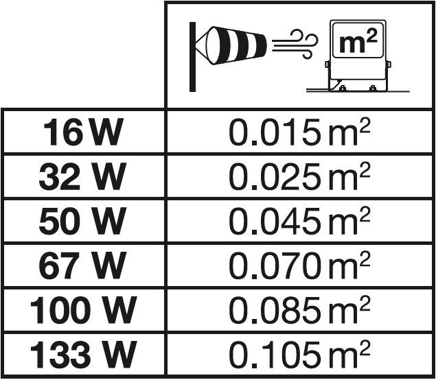 Reflektor z soczewkową emisją światła do 150 lm/W. Cechy produktu: Wysoka skuteczność świetlna: do 150 lm/W. Asymetryczny rozsył strumienia świetlnego do różnych obszarów zastosowań. Funkcja Multi Lumen umożliwiająca dostosowanie poziomów jasności do konkretnych potrzeb. Stopień ochrony: IP66. Odporność na korozję C4: nadaje się do stosowania w środowiskach o umiarkowanym zasoleniu. Fabrycznie zainstalowany, elastyczny przewód o długości 1 m (H05RN-F), 3 x 1,0 mm². Zaciski montażowe z kątem 30° i szerokim obszarem obrotu. Zalety produktu: Zawór odpowietrzający optymalizujący wymianę powietrza, bez uszczerbku dla stopnia ochrony IP. Wysoka wszechstronność dzięki wybieranym stopniom mocy (Multi Lumen) na obudowie. Solidna dławnica kablowa ze zintegrowaną funkcją bariery wodnej. Wysoka równomierność oświetlenia i niski poziom olśnienia dzięki precyzyjnej konstrukcji soczewek. Jasna, odporna i trwała. Oszczędność energii aż do 90% (w porównaniu z naświetlaczami z lampami halogenowymi). Brak górnego współczynnika rozsyłu światła (ULOR 0%) w przypadku zamontowania pod kątem 0°. Obszary zastosowań: Zamiennik naświetlaczy do żarówek halogenowych. Zastosowania zewnętrzne (IP66). Konstrukcja zgodna z normą EN 60598-2-24 dotyczącą zagrożenia pożarowego, np. poprzez nagromadzenie pyłów. Strefy publiczne. Obiekty sportowe. Tereny budowy. Parking. Obszary logistyczne, drogi transportowe, korytarze. Porady dotyczące bezpieczeństwa: Maksymalna powierzchnia obciążenia wiatrem 16 W = 0,015 m² / 32 W = 0,025 m² / 50 W = 0,045 m² / 67 W = 0,070 m² / 100 W = 0,085 m² / 133 W = 0,105 m²