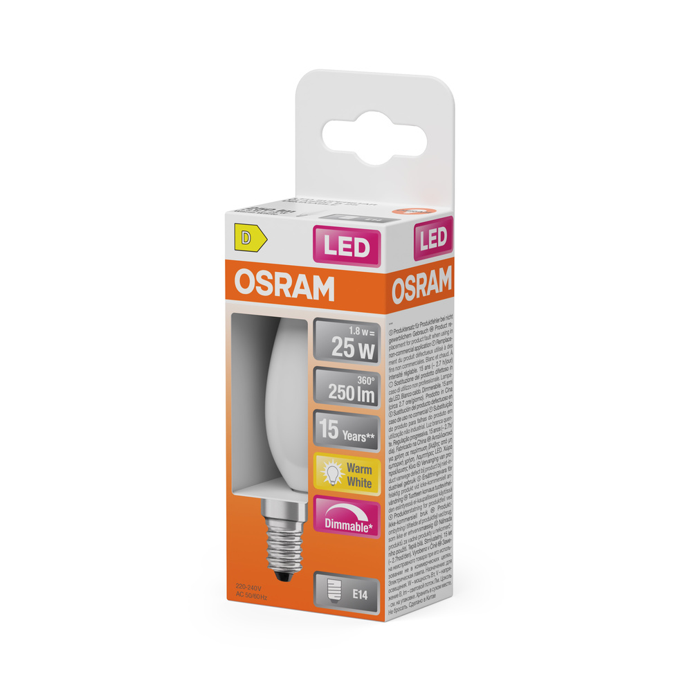 Ściemnialne lampy LED, kształt żarówki świecowej. Cechy produktu: Lampy LED dla napięcia sieciowego. Ściemnialne (za pomocą licznych popularnych ściemniaczy, zobacz więcej www.ledvance.pl/dim). Kąt wiązki światła: do 300°. Trwałość do 15 000 h. Lampa wykonana ze szkła. Dobra jakość światła, wskaźnik oddawania barw Ra: ≥ 80; stała chromatyczność. Zalety produktu: Lampy wyposażone w innowacyjną technologię „włókien” LED. Niższe zużycie energii w porównaniu do lamp żarowych lub halogenowych. Natychmiast 100 % światła, bez czasu nagrzewania. Łatwy montaż zamiast zwykłych żarówek. Konstrukcja, wymiary i strumień świetlny porównywalne z tradycyjną żarówką. Obszary zastosowań: Doskonałe rozwiązanie do instalacji dekoracyjnych. Zastosowania dekoracyjne. Oświetlenie ogólne. Do użytku na zewnątrz tylko w odpowiednich oprawach zewnętrznych. Porady dotyczące bezpieczeństwa: Nie dotykaj lampy, jeśli jest stłuczona.. Nie wolno używać, jeśli zewnętrzne źródło światła jest uszkodzone..
