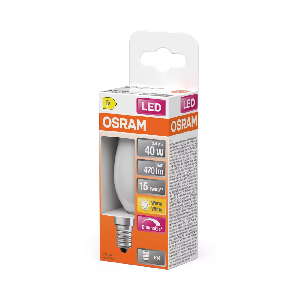 Ściemnialne lampy LED, kształt żarówki świecowej. Cechy produktu: Lampy LED dla napięcia sieciowego. Ściemnialne (za pomocą licznych popularnych ściemniaczy, zobacz więcej www.ledvance.pl/dim). Kąt wiązki światła: do 300°. Trwałość do 15 000 h. Lampa wykonana ze szkła. Dobra jakość światła, wskaźnik oddawania barw Ra: ≥ 80; stała chromatyczność. Zalety produktu: Lampy wyposażone w innowacyjną technologię „włókien” LED. Niższe zużycie energii w porównaniu do lamp żarowych lub halogenowych. Natychmiast 100 % światła, bez czasu nagrzewania. Łatwy montaż zamiast zwykłych żarówek. Konstrukcja, wymiary i strumień świetlny porównywalne z tradycyjną żarówką. Obszary zastosowań: Doskonałe rozwiązanie do instalacji dekoracyjnych. Zastosowania dekoracyjne. Oświetlenie ogólne. Do użytku na zewnątrz tylko w odpowiednich oprawach zewnętrznych. Porady dotyczące bezpieczeństwa: Nie dotykaj lampy, jeśli jest stłuczona.. Nie wolno używać, jeśli zewnętrzne źródło światła jest uszkodzone..