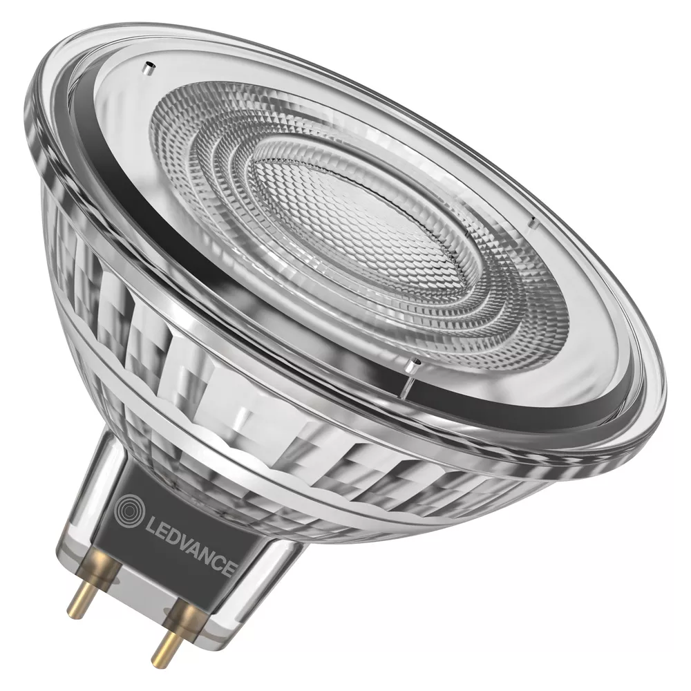 Niskonapięciowe reflektorowe lampy LED MR16 z możliwością regulacji strumienia. Cechy produktu: Zamiennik LED dla niskonapięciowych żarówek halogenowych. Wysoka jedorodność barw: ≤ 5 sdcm. Ściemnialne. Trzonek: GU5.3. Lampa wykonana ze szkła. Bardzo dobre oddawanie barw (Ra: 90). Trwałość: do 25 000 h. Zalety produktu: Szybka, prosta i bezpieczna wymiana bez zmiany okablowania. Wygląd, wymiary i strumień świetlny porównywalne z tradycyjnymi żarówkami lub żarówkami halogenowymi. Niski koszt konserwacji dzięki długiej trwałości. Brak promieniowania UV i podczerwonego w wiązce światła. Bezstopniowe ściemnianie. Bardzo wysoka kompatybilność ze ściemniaczem, patrz również www.ledvance.com/dim. Kompatybilny z wieloma popularnymi statecznikami konwencjonalnymi i elektronicznymi (patrz także Hyperlink target ="https://www.ledvance.com/low-voltage-ledlamps"lista kompatybilności/Hyperlink). Natychmiast 100 % światła, bez czasu nagrzewania. Niższe zużycie energii w porównaniu do lamp żarowych lub halogenowych. Obszary zastosowań: Sklepy i pomieszczenia wystawowe. Zastosowania domowe. Zastosowania komercyjne. Oświetlenie akcentujące. Do użytku na zewnątrz tylko w odpowiednich oprawach zewnętrznych. Porady dotyczące bezpieczeństwa: Nie dotykaj lampy, jeśli jest stłuczona.. Nie wolno używać, jeśli zewnętrzne źródło światła jest uszkodzone..