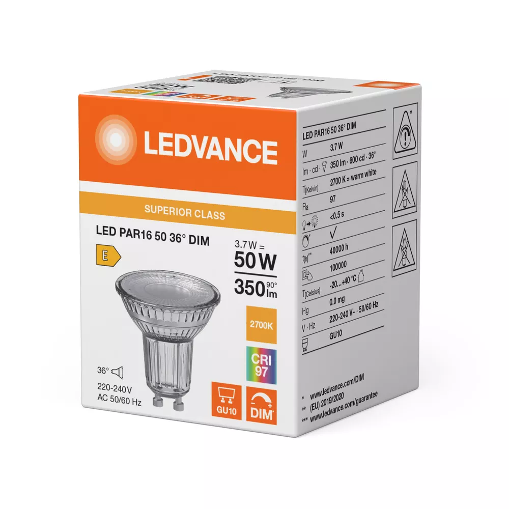 Reflektorowe lampy LED. Cechy produktu: Zamiennik LED dla wysokonapięciowych żarówek halogenowych. Wysoka jednolitość barwy : ≤ 3 SDCM. Ściemnialne. Trzonek: GU10. Lampa wykonana ze szkła. Wysoki wskaźnik oddawania barw (Ra: 97). Trwałość: do 40 000 h. Zalety produktu: Szybka, prosta i bezpieczna wymiana bez zmiany okablowania. Wygląd, wymiary i strumień świetlny porównywalne z tradycyjnymi żarówkami lub żarówkami halogenowymi. Niski koszt konserwacji dzięki długiej trwałości. Brak promieniowania UV i podczerwonego w wiązce światła. Bezstopniowe ściemnianie. Bardzo wysoka kompatybilność ze ściemniaczem, patrz również www.ledvance.com/dim. Natychmiast 100 % światła, bez czasu nagrzewania. Niższe zużycie energii w porównaniu do lamp żarowych lub halogenowych. Obszary zastosowań: Sklepy i pomieszczenia wystawowe. Zastosowania domowe. Zastosowania komercyjne. Oświetlenie akcentujące. Do użytku na zewnątrz tylko w odpowiednich oprawach zewnętrznych. Porady dotyczące bezpieczeństwa: Nie dotykaj lampy, jeśli jest stłuczona.. Nie wolno używać, jeśli zewnętrzne źródło światła jest uszkodzone..