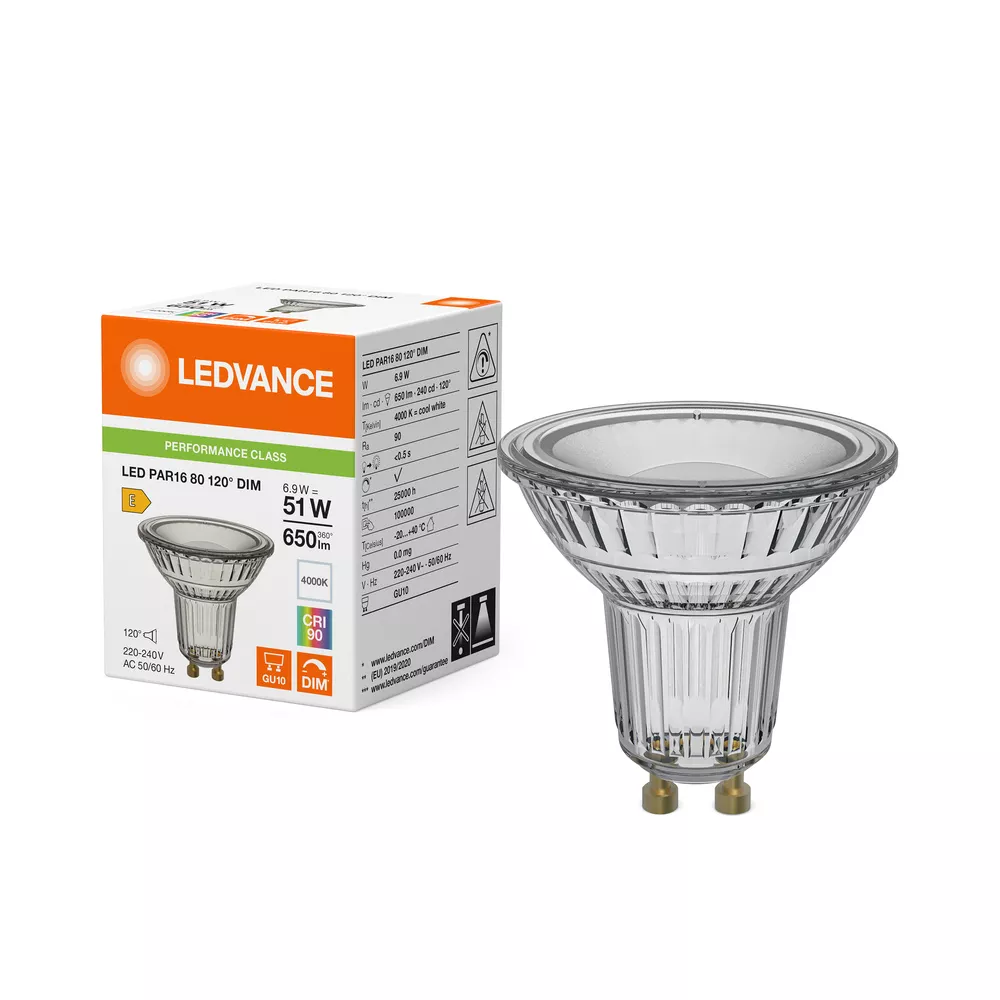 Reflektorowe lampy LED PAR16 z możliwością regulacji strumienia. Cechy produktu: Zamiennik LED dla wysokonapięciowych żarówek halogenowych. Wysoka jedorodność barw: ≤ 5 sdcm. Ściemnialne. Lampa wykonana ze szkła. Zalety produktu: Szybka, prosta i bezpieczna wymiana bez zmiany okablowania. Wygląd, wymiary i strumień świetlny porównywalne z tradycyjnymi żarówkami lub żarówkami halogenowymi. Niski koszt konserwacji dzięki długiej trwałości. Brak promieniowania UV i podczerwonego w wiązce światła. Bezstopniowe ściemnianie. Bardzo wysoka kompatybilność ze ściemniaczem, patrz również www.ledvance.com/dim. Natychmiast 100 % światła, bez czasu nagrzewania. Niższe zużycie energii w porównaniu do lamp żarowych lub halogenowych. Obszary zastosowań: Sklepy i pomieszczenia wystawowe. Zastosowania domowe. Zastosowania komercyjne. Oświetlenie akcentujące. Do użytku na zewnątrz tylko w odpowiednich oprawach zewnętrznych. Porady dotyczące bezpieczeństwa: Nie dotykaj lampy, jeśli jest stłuczona.. Nie wolno używać, jeśli zewnętrzne źródło światła jest uszkodzone..