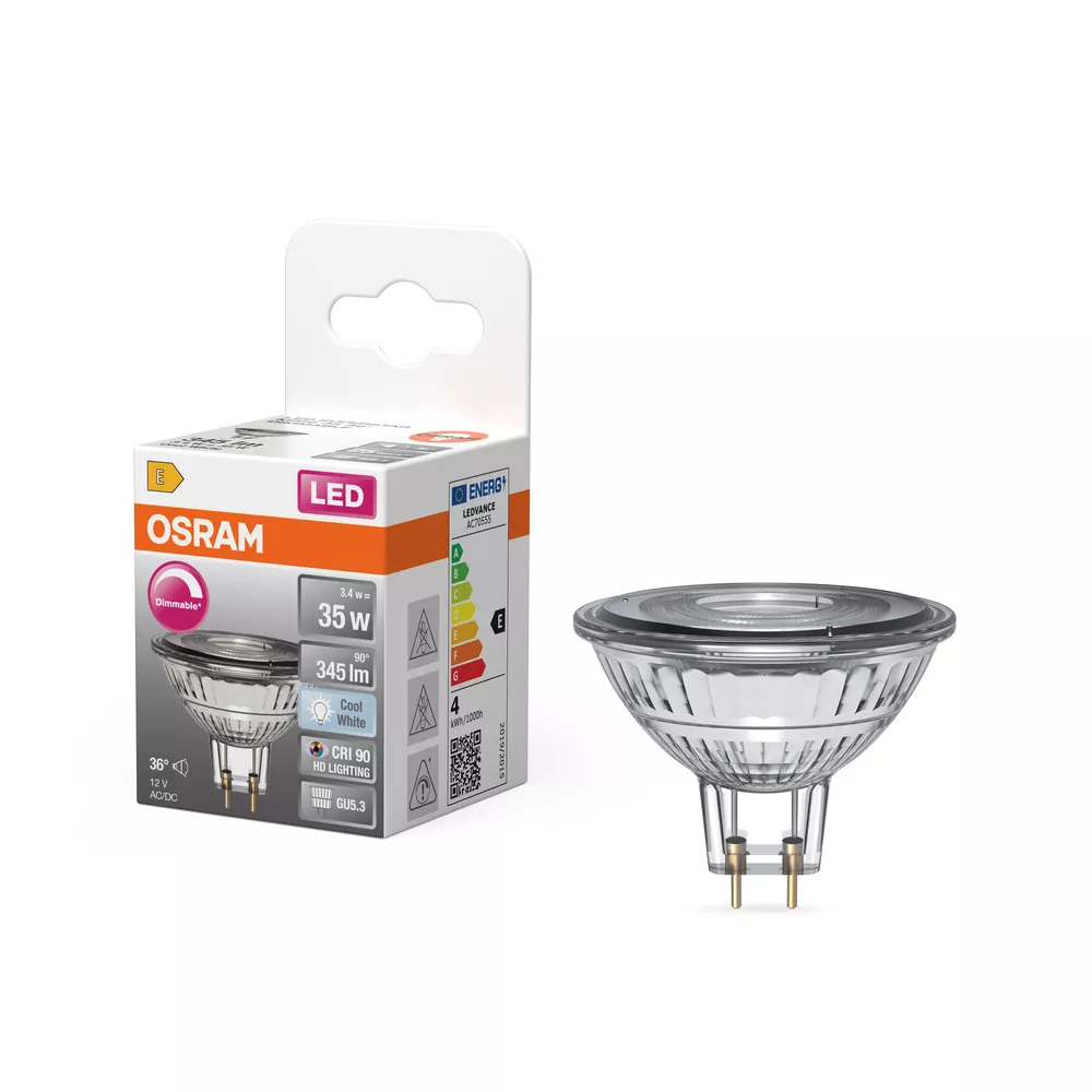 Niskonapięciowe reflektorowe lampy LED MR16 z możliwością regulacji strumienia. Cechy produktu: Zamienniki LED dla konwencjonalnych żarówek niskonapięciowych. Ściemnialne (za pomocą licznych popularnych ściemniaczy, zobacz więcej www.ledvance.pl/dim). Lampy niezawierające rtęci. Zalety produktu: Długa trwałość do 25 000 godzin. Niższe zużycie energii w porównaniu do lamp żarowych lub halogenowych. Wysoka spójność barw dzięki precyzyjnemu sortowaniu struktur półprzewodnikowych. Łatwa wymiana żarówek halogenowych dzięki kompaktowej w pełni szklanej konstrukcji i pojedynczemu układowi optycznemu. Idealne, ekonomiczne reflektory kierunkowe. Obszary zastosowań: Sklepy. Hotele. Muzea, galerie sztuki. Pomieszczenia mieszkalne. Jako światło wpuszczane do oznaczania przejść, drzwi, schodów itp.. Oświetlenie kierunkowe akcentujące. Szafki do ekspozycji i witryny sklepowe. Oświetlenie kierunkowe obiektów wrażliwych na ciepło, np. żywności roślin itp.. Do użytku na zewnątrz tylko w odpowiednich oprawach zewnętrznych. Porady dotyczące bezpieczeństwa: Nie dotykaj lampy, jeśli jest stłuczona.. Nie wolno używać, jeśli zewnętrzne źródło światła jest uszkodzone..