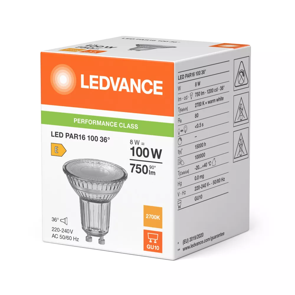 Reflektorowe lampy LED PAR16 z trzonkiem kołkowym. Cechy produktu: Zamiennik LED dla wysokonapięciowych żarówek halogenowych. Wysoka jedorodność barw: ≤ 6 SDCM. Brak możliwości regulacji strumienia świetlnego. Lampa wykonana ze szkła. Dobra jakość światła, wskaźnik oddawania barw Ra: ≥ 80. Zalety produktu: Szybka, prosta i bezpieczna wymiana bez zmiany okablowania. Wygląd, wymiary i strumień świetlny porównywalne z tradycyjnymi żarówkami lub żarówkami halogenowymi. Niski koszt konserwacji dzięki długiej trwałości. Brak promieniowania UV i podczerwonego w wiązce światła. Natychmiast 100 % światła, bez czasu nagrzewania. Niższe zużycie energii w porównaniu do lamp żarowych lub halogenowych. Obszary zastosowań: Sklepy i pomieszczenia wystawowe. Zastosowania domowe. Zastosowania komercyjne. Oświetlenie akcentujące. Do użytku na zewnątrz tylko w odpowiednich oprawach zewnętrznych. Porady dotyczące bezpieczeństwa: Nie dotykaj lampy, jeśli jest stłuczona.. Nie wolno używać, jeśli zewnętrzne źródło światła jest uszkodzone..