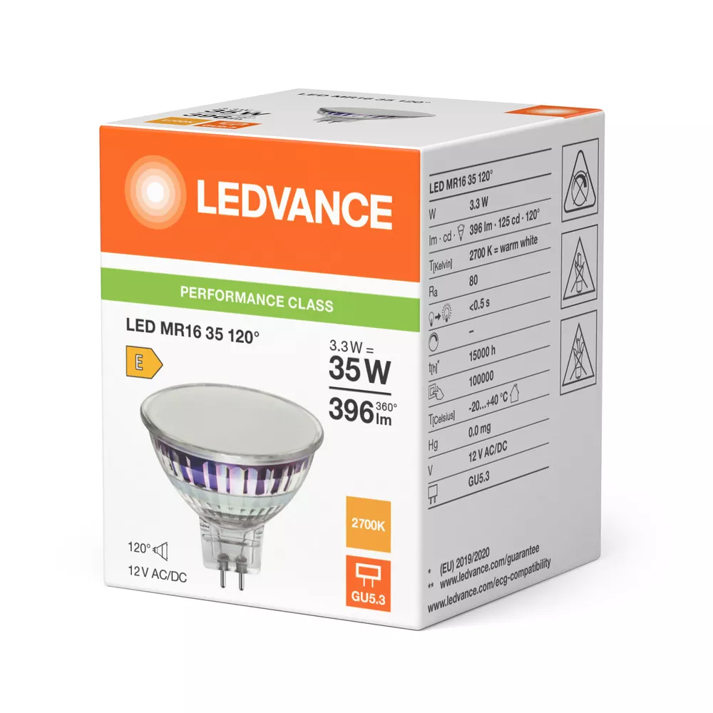 Niskonapięciowe reflektorowe lampy LED MR16 z trzonkiem kołkowym. Cechy produktu: Zamiennik LED dla niskonapięciowych żarówek halogenowych. Wysoka jedorodność barw: ≤ 6 SDCM. Brak możliwości regulacji strumienia świetlnego. Trzonek: GU5.3. Lampa wykonana ze szkła. Dobra jakość światła, wskaźnik oddawania barw Ra: ≥ 80. Trwałość do 15 000 h. Zalety produktu: Szybka, prosta i bezpieczna wymiana bez zmiany okablowania. Wygląd, wymiary i strumień świetlny porównywalne z tradycyjnymi żarówkami lub żarówkami halogenowymi. Niski koszt konserwacji dzięki długiej trwałości. Brak promieniowania UV i podczerwonego w wiązce światła. Natychmiast 100 % światła, bez czasu nagrzewania. Niższe zużycie energii w porównaniu do lamp żarowych lub halogenowych. Obszary zastosowań: Sklepy i pomieszczenia wystawowe. Zastosowania domowe. Zastosowania komercyjne. Oświetlenie akcentujące. Do użytku na zewnątrz tylko w odpowiednich oprawach zewnętrznych. Wyposażenie / Akcesoria: Wyposażone w LED wysokiej mocy. Porady dotyczące bezpieczeństwa: Nie dotykaj lampy, jeśli jest stłuczona.. Nie wolno używać, jeśli zewnętrzne źródło światła jest uszkodzone..