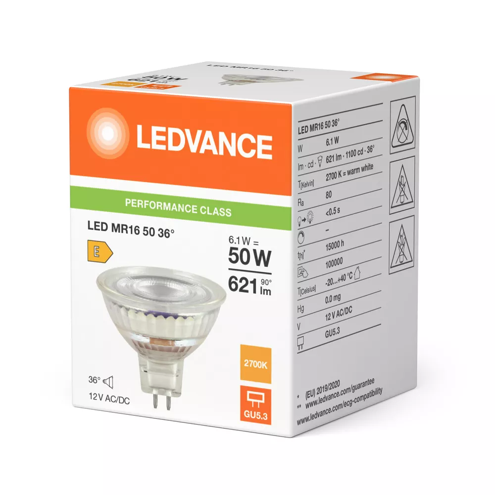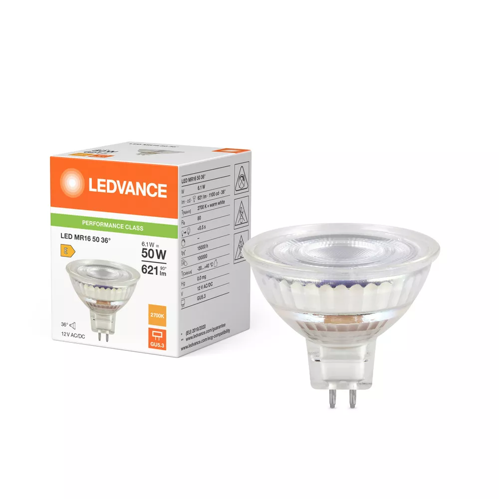 Niskonapięciowe reflektorowe lampy LED MR16 z trzonkiem kołkowym. Cechy produktu: Zamiennik LED dla niskonapięciowych żarówek halogenowych. Wysoka jedorodność barw: ≤ 6 SDCM. Brak możliwości regulacji strumienia świetlnego. Trzonek: GU5.3. Lampa wykonana ze szkła. Dobra jakość światła, wskaźnik oddawania barw Ra: ≥ 80. Trwałość do 15 000 h. Zalety produktu: Szybka, prosta i bezpieczna wymiana bez zmiany okablowania. Wygląd, wymiary i strumień świetlny porównywalne z tradycyjnymi żarówkami lub żarówkami halogenowymi. Niski koszt konserwacji dzięki długiej trwałości. Brak promieniowania UV i podczerwonego w wiązce światła. Natychmiast 100 % światła, bez czasu nagrzewania. Niższe zużycie energii w porównaniu do lamp żarowych lub halogenowych. Obszary zastosowań: Sklepy i pomieszczenia wystawowe. Zastosowania domowe. Zastosowania komercyjne. Oświetlenie akcentujące. Do użytku na zewnątrz tylko w odpowiednich oprawach zewnętrznych. Wyposażenie / Akcesoria: Wyposażone w LED wysokiej mocy. Porady dotyczące bezpieczeństwa: Nie dotykaj lampy, jeśli jest stłuczona.. Nie wolno używać, jeśli zewnętrzne źródło światła jest uszkodzone..