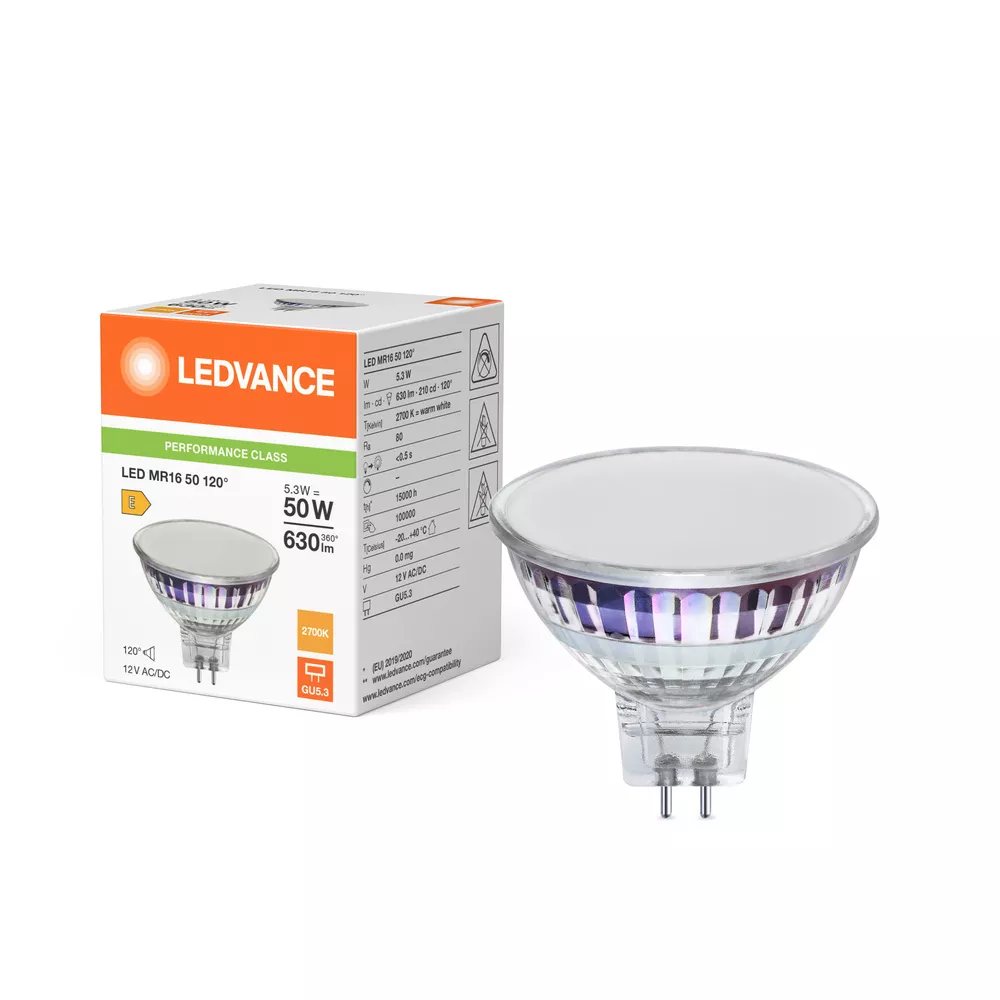 Niskonapięciowe reflektorowe lampy LED MR16 z trzonkiem kołkowym. Cechy produktu: Zamiennik LED dla niskonapięciowych żarówek halogenowych. Wysoka jedorodność barw: ≤ 6 SDCM. Brak możliwości regulacji strumienia świetlnego. Trzonek: GU5.3. Lampa wykonana ze szkła. Dobra jakość światła, wskaźnik oddawania barw Ra: ≥ 80. Trwałość do 15 000 h. Zalety produktu: Szybka, prosta i bezpieczna wymiana bez zmiany okablowania. Wygląd, wymiary i strumień świetlny porównywalne z tradycyjnymi żarówkami lub żarówkami halogenowymi. Niski koszt konserwacji dzięki długiej trwałości. Brak promieniowania UV i podczerwonego w wiązce światła. Natychmiast 100 % światła, bez czasu nagrzewania. Niższe zużycie energii w porównaniu do lamp żarowych lub halogenowych. Obszary zastosowań: Sklepy i pomieszczenia wystawowe. Zastosowania domowe. Zastosowania komercyjne. Oświetlenie akcentujące. Do użytku na zewnątrz tylko w odpowiednich oprawach zewnętrznych. Wyposażenie / Akcesoria: Wyposażone w LED wysokiej mocy. Porady dotyczące bezpieczeństwa: Nie dotykaj lampy, jeśli jest stłuczona.. Nie wolno używać, jeśli zewnętrzne źródło światła jest uszkodzone..