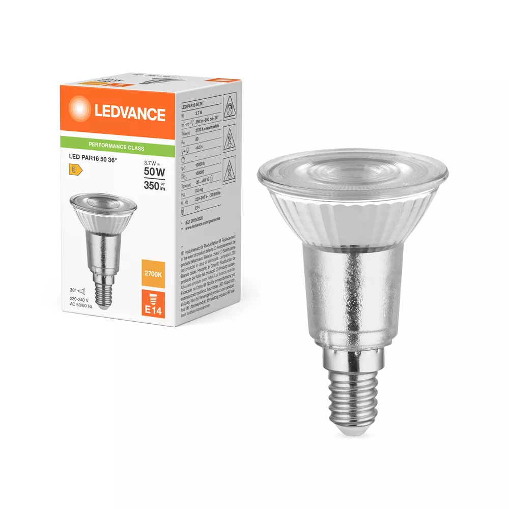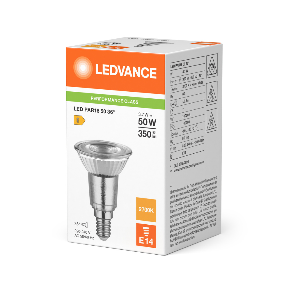 Reflektorowe lampy LED PAR16 z trzonkiem kołkowym. Cechy produktu: Zamiennik LED dla wysokonapięciowych żarówek halogenowych. Wysoka jedorodność barw: ≤ 6 SDCM. Brak możliwości regulacji strumienia świetlnego. Lampa wykonana ze szkła. Dobra jakość światła, wskaźnik oddawania barw Ra: ≥ 80. Zalety produktu: Szybka, prosta i bezpieczna wymiana bez zmiany okablowania. Wygląd, wymiary i strumień świetlny porównywalne z tradycyjnymi żarówkami lub żarówkami halogenowymi. Niski koszt konserwacji dzięki długiej trwałości. Brak promieniowania UV i podczerwonego w wiązce światła. Natychmiast 100 % światła, bez czasu nagrzewania. Niższe zużycie energii w porównaniu do lamp żarowych lub halogenowych. Obszary zastosowań: Sklepy i pomieszczenia wystawowe. Zastosowania domowe. Zastosowania komercyjne. Oświetlenie akcentujące. Do użytku na zewnątrz tylko w odpowiednich oprawach zewnętrznych. Porady dotyczące bezpieczeństwa: Nie dotykaj lampy, jeśli jest stłuczona.. Nie wolno używać, jeśli zewnętrzne źródło światła jest uszkodzone..