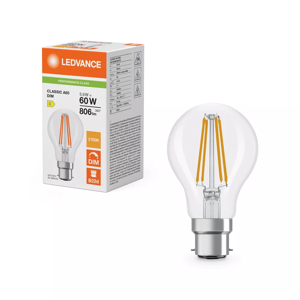 Ściemnialne lampy LED, klasyczny kształt żarówki . Cechy produktu: Profesjonalne lampy dla napięcia sieciowego. Kąt wiązki światła: do 300°. Ściemnialne. Trzonek: E27, B22d. Trwałość do 15 000 h. Lampa wykonana ze szkła. Dobra jakość światła, wskaźnik oddawania barw Ra: ≥ 80; stała chromatyczność. Zalety produktu: Wygląd, wymiary i strumień świetlny porównywalne z tradycyjnymi żarówkami lub żarówkami halogenowymi. Niższe zużycie energii w porównaniu do lamp żarowych lub halogenowych. Odporność na drgania. Brak promieniowania UV i podczerwonego w wiązce światła. Natychmiast 100 % światła, bez czasu nagrzewania. Łatwy montaż zamiast zwykłych żarówek. Obszary zastosowań: Doskonałe rozwiązanie do instalacji dekoracyjnych. Zastosowania domowe. Oświetlenie ogólne. Do użytku na zewnątrz tylko w odpowiednich oprawach zewnętrznych. Porady dotyczące bezpieczeństwa: Nie dotykaj lampy, jeśli jest stłuczona.. Nie wolno używać, jeśli zewnętrzne źródło światła jest uszkodzone..