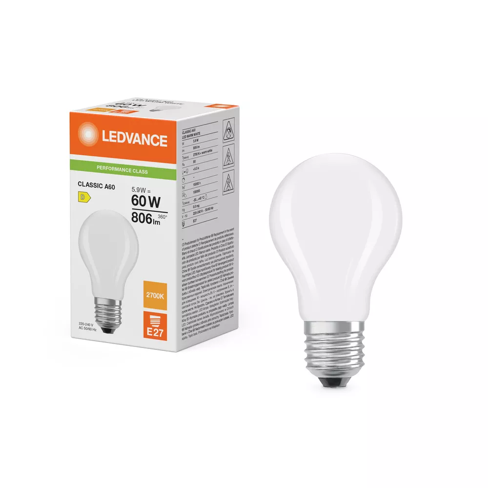 Lampy LED, klasyczny kształt żarówki. Cechy produktu: Profesjonalne lampy dla napięcia sieciowego. Kąt wiązki światła: do 300°. Brak możliwości regulacji strumienia świetlnego. Trzonek: E27. Trwałość do 15 000 h. Lampa wykonana ze szkła. Dobra jakość światła, wskaźnik oddawania barw Ra: ≥ 80; stała chromatyczność. Zalety produktu: Lampy wyposażone w innowacyjną technologię „włókien” LED. Wygląd, wymiary i strumień świetlny porównywalne z tradycyjnymi żarówkami lub żarówkami halogenowymi. Niższe zużycie energii w porównaniu do lamp żarowych lub halogenowych. Brak promieniowania UV i podczerwonego w wiązce światła. Natychmiast 100 % światła, bez czasu nagrzewania. Łatwy montaż zamiast zwykłych żarówek. Obszary zastosowań: Doskonałe rozwiązanie do instalacji dekoracyjnych. Zastosowania domowe. Oświetlenie ogólne. Do użytku na zewnątrz tylko w odpowiednich oprawach zewnętrznych. Porady dotyczące bezpieczeństwa: Nie dotykaj lampy, jeśli jest stłuczona.. Nie wolno używać, jeśli zewnętrzne źródło światła jest uszkodzone..