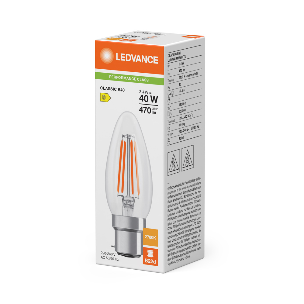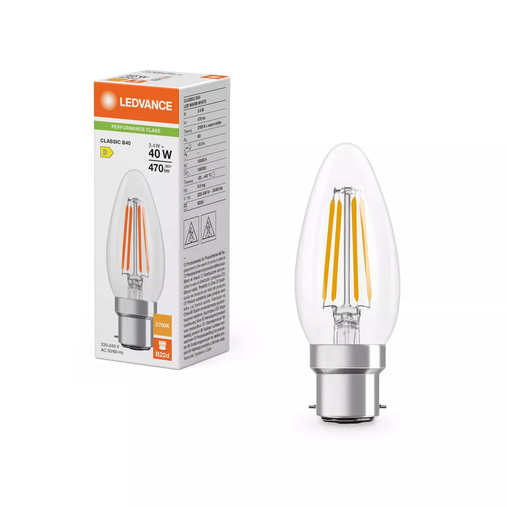 Lampki LED , klasyczny kształt świecy. Cechy produktu: Profesjonalne lampy dla napięcia sieciowego. Kąt wiązki światła: do 300°. Trwałość do 15 000 h. Lampa wykonana ze szkła. Dobra jakość światła, wskaźnik oddawania barw Ra: ≥ 80; stała chromatyczność. Zalety produktu: Lampy wyposażone w innowacyjną technologię „włókien” LED. Wygląd, wymiary i strumień świetlny porównywalne z tradycyjnymi żarówkami lub żarówkami halogenowymi. Brak promieniowania UV i podczerwonego w wiązce światła. Natychmiast 100 % światła, bez czasu nagrzewania. Łatwy montaż zamiast zwykłych żarówek. Niskie obciążenie cieplne (w porównaniu ze standardowym produktem referencyjnym). Niższe zużycie energii w porównaniu do lamp żarowych lub halogenowych. Obszary zastosowań: Doskonałe rozwiązanie do instalacji dekoracyjnych. Zastosowania domowe. Oświetlenie ogólne. Do użytku na zewnątrz tylko w odpowiednich oprawach zewnętrznych. Porady dotyczące bezpieczeństwa: Nie dotykaj lampy, jeśli jest stłuczona.. Nie wolno używać, jeśli zewnętrzne źródło światła jest uszkodzone..