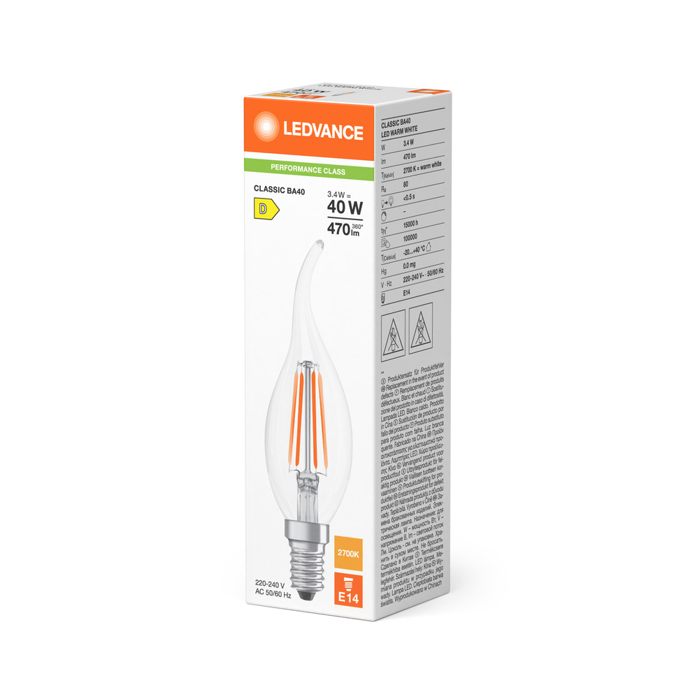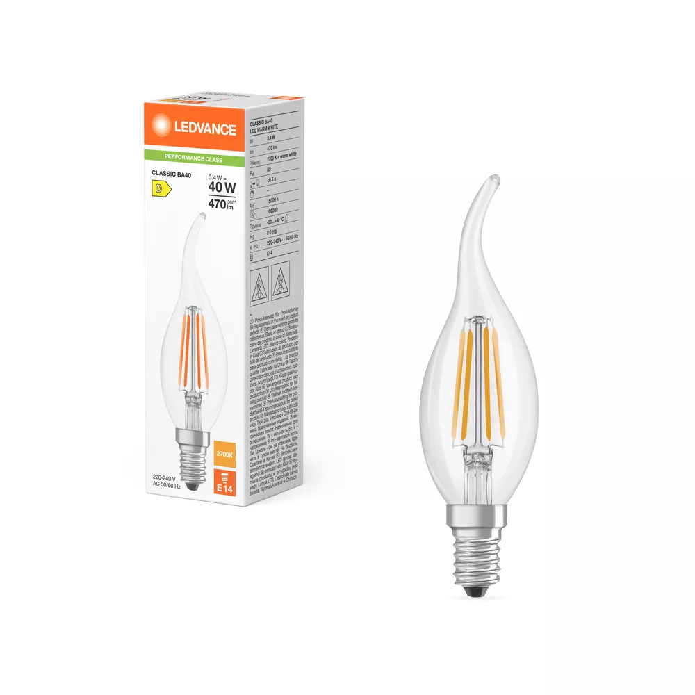 Lampki LED , klasyczny kształt świecy. Cechy produktu: Profesjonalne lampy dla napięcia sieciowego. Kąt wiązki światła: do 300°. Brak możliwości regulacji strumienia świetlnego. Trzonek: E14. Trwałość do 15 000 h. Lampa wykonana ze szkła. Dobra jakość światła, wskaźnik oddawania barw Ra: ≥ 80; stała chromatyczność. Zalety produktu: Lampy wyposażone w innowacyjną technologię „włókien” LED. Wygląd, wymiary i strumień świetlny porównywalne z tradycyjnymi żarówkami lub żarówkami halogenowymi. Niższe zużycie energii w porównaniu do lamp żarowych lub halogenowych. Brak promieniowania UV i podczerwonego w wiązce światła. Natychmiast 100 % światła, bez czasu nagrzewania. Łatwy montaż zamiast zwykłych żarówek. Obszary zastosowań: Doskonałe rozwiązanie do instalacji dekoracyjnych. Zastosowania domowe. Oświetlenie ogólne. Do użytku na zewnątrz tylko w odpowiednich oprawach zewnętrznych. Porady dotyczące bezpieczeństwa: Nie dotykaj lampy, jeśli jest stłuczona.. Nie wolno używać, jeśli zewnętrzne źródło światła jest uszkodzone..
