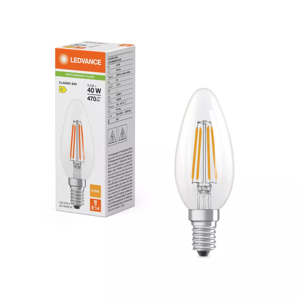 Lampki LED , klasyczny kształt świecy. Cechy produktu: Profesjonalne lampy dla napięcia sieciowego. Kąt wiązki światła: do 300°. Trwałość do 15 000 h. Lampa wykonana ze szkła. Dobra jakość światła, wskaźnik oddawania barw Ra: ≥ 80; stała chromatyczność. Zalety produktu: Lampy wyposażone w innowacyjną technologię „włókien” LED. Wygląd, wymiary i strumień świetlny porównywalne z tradycyjnymi żarówkami lub żarówkami halogenowymi. Brak promieniowania UV i podczerwonego w wiązce światła. Natychmiast 100 % światła, bez czasu nagrzewania. Łatwy montaż zamiast zwykłych żarówek. Niskie obciążenie cieplne (w porównaniu ze standardowym produktem referencyjnym). Niższe zużycie energii w porównaniu do lamp żarowych lub halogenowych. Obszary zastosowań: Doskonałe rozwiązanie do instalacji dekoracyjnych. Zastosowania domowe. Oświetlenie ogólne. Do użytku na zewnątrz tylko w odpowiednich oprawach zewnętrznych. Porady dotyczące bezpieczeństwa: Nie dotykaj lampy, jeśli jest stłuczona.. Nie wolno używać, jeśli zewnętrzne źródło światła jest uszkodzone..