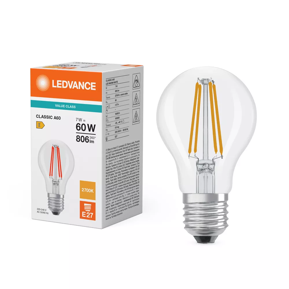 Lampy LED, klasyczny kształt żarówki. Cechy produktu: LED zamienniki tradycyjnych żarówek. Brak możliwości regulacji strumienia świetlnego. Dobre oddawanie barw (Ra ≥ 80) i stabilność braw przez cały czas eksploatacji lampy. Zalety produktu: Niższe zużycie energii w porównaniu do lamp żarowych lub halogenowych. Łatwy montaż zamiast zwykłych żarówek. Obszary zastosowań: Zastosowania domowe. Oświetlenie ogólne. Do użytku na zewnątrz tylko w odpowiednich oprawach zewnętrznych. Porady dotyczące bezpieczeństwa: Nie dotykaj lampy, jeśli jest stłuczona.. Nie wolno używać, jeśli zewnętrzne źródło światła jest uszkodzone..