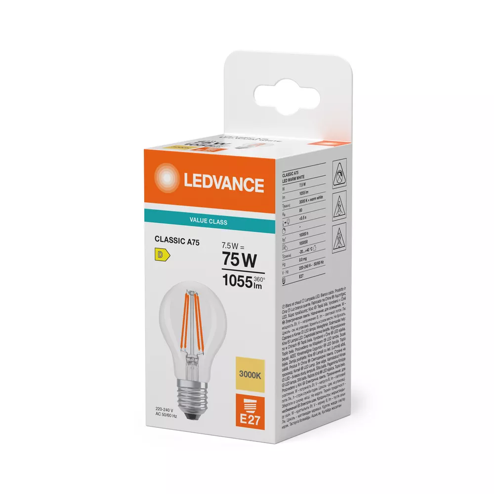 Lampy LED, klasyczny kształt żarówki. Cechy produktu: LED zamienniki tradycyjnych żarówek. Brak możliwości regulacji strumienia świetlnego. Dobre oddawanie barw (Ra ≥ 80) i stabilność braw przez cały czas eksploatacji lampy. Zalety produktu: Niższe zużycie energii w porównaniu do lamp żarowych lub halogenowych. Łatwy montaż zamiast zwykłych żarówek. Obszary zastosowań: Zastosowania domowe. Oświetlenie ogólne. Do użytku na zewnątrz tylko w odpowiednich oprawach zewnętrznych. Porady dotyczące bezpieczeństwa: Nie dotykaj lampy, jeśli jest stłuczona.. Nie wolno używać, jeśli zewnętrzne źródło światła jest uszkodzone..