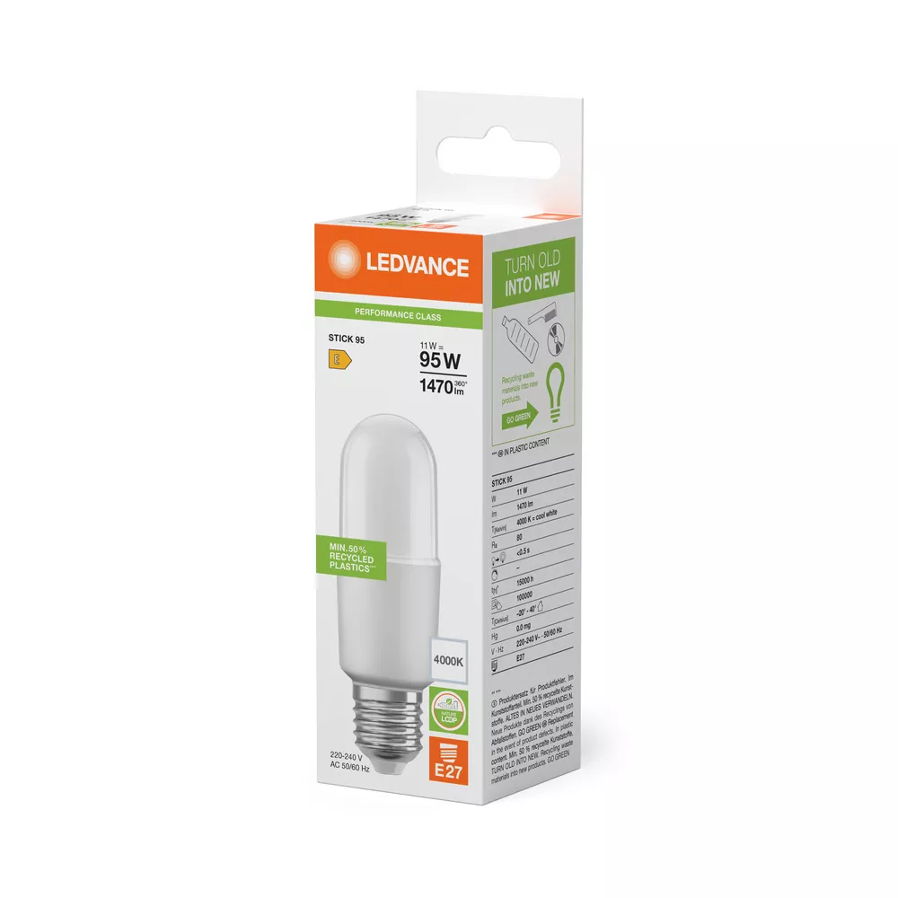 Lampy LED o tradycyjnym kształcie. Cechy produktu: LED zamienniki tradycyjnych żarówek. Trwałość do 15 000 h. Brak możliwości regulacji strumienia świetlnego. Użyto co najmniej 50% plastiku pochodzącego z recyklingu (w stosunku do całkowitej masy plastiku). Dobra jakość światła, wskaźnik oddawania barw Ra: ≥ 80; stała chromatyczność. Zalety produktu: Niższe zużycie energii w porównaniu do lamp żarowych lub halogenowych. Atrakcyjny wygląd lamp. Natychmiast 100 % światła, bez czasu nagrzewania. Wykonana z tworzyw sztucznych pochodzących z recyklingu lampa przyczynia się do ograniczenia emisji CO2 i ilości odpadów składowanych na wysypiskach. Obszary zastosowań: Wszystkie pomieszczenia mieszkalne, zwłaszcza tam, gdzie lampy są widoczne. Tam, gdzie potrzebne są wydajne lampy kompaktowe. Do użytku na zewnątrz tylko w odpowiednich oprawach zewnętrznych. Porady dotyczące bezpieczeństwa: Nie dotykaj lampy, jeśli jest stłuczona.. Nie wolno używać, jeśli zewnętrzne źródło światła jest uszkodzone..