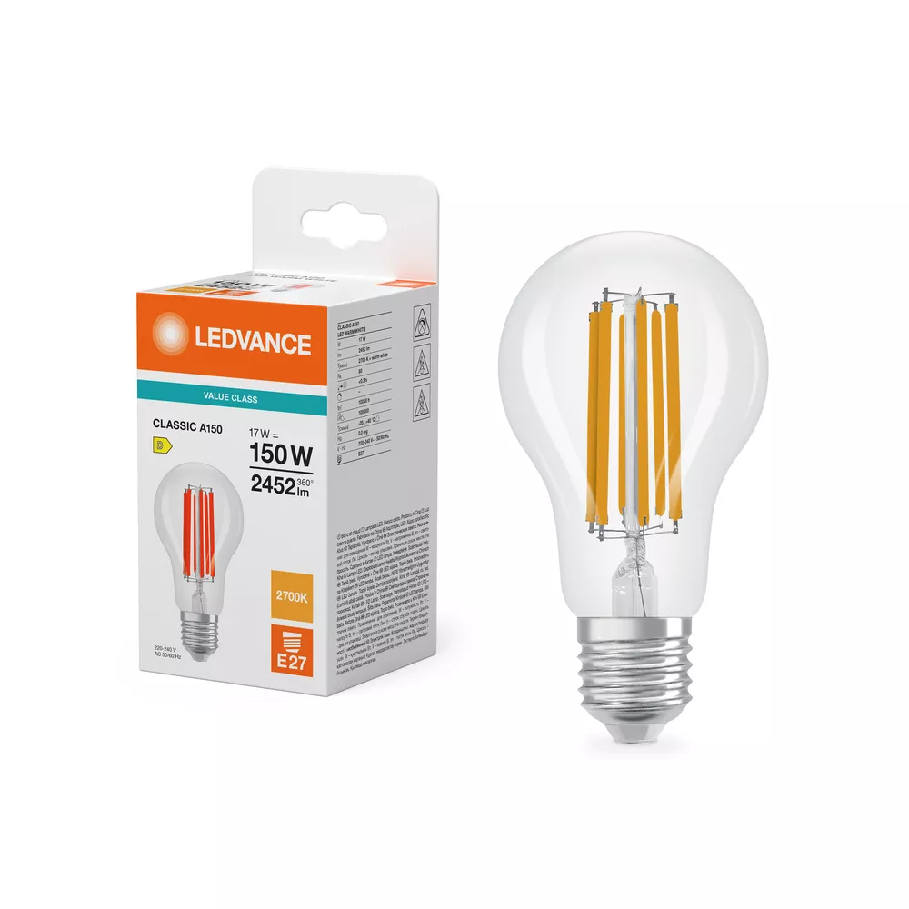 Lampy LED, klasyczny kształt żarówki. Cechy produktu: LED zamienniki tradycyjnych żarówek. Brak możliwości regulacji strumienia świetlnego. Dobre oddawanie barw (Ra ≥ 80) i stabilność braw przez cały czas eksploatacji lampy. Zalety produktu: Niższe zużycie energii w porównaniu do lamp żarowych lub halogenowych. Łatwy montaż zamiast zwykłych żarówek. Obszary zastosowań: Zastosowania domowe. Oświetlenie ogólne. Do użytku na zewnątrz tylko w odpowiednich oprawach zewnętrznych. Porady dotyczące bezpieczeństwa: Nie dotykaj lampy, jeśli jest stłuczona.. Nie wolno używać, jeśli zewnętrzne źródło światła jest uszkodzone..
