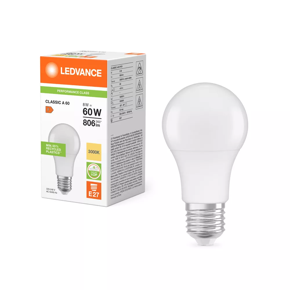 Lampy LED , klasyczna żarówka A z plastiku pochodzącego z recyklingu. Cechy produktu: Profesjonalne lampy dla napięcia sieciowego. Brak możliwości regulacji strumienia świetlnego. Użyto co najmniej 50% plastiku pochodzącego z recyklingu (w stosunku do całkowitej masy plastiku). Trwałość do 15 000 h. Dobra jakość światła, wskaźnik oddawania barw Ra: ≥ 80; stała chromatyczność. Zalety produktu: Niższe zużycie energii w porównaniu do lamp żarowych lub halogenowych. Prosty w użyciu zamiennik żarówek klasycznych dzięki kompaktowej konstrukcji. Natychmiast 100 % światła, bez czasu nagrzewania. Wykonana z tworzyw sztucznych pochodzących z recyklingu lampa przyczynia się do ograniczenia emisji CO2 i ilości odpadów składowanych na wysypiskach. Obszary zastosowań: Zastosowania domowe. Oświetlenie ogólne. Do użytku na zewnątrz tylko w odpowiednich oprawach zewnętrznych. Porady dotyczące bezpieczeństwa: Nie dotykaj lampy, jeśli jest stłuczona.. Nie wolno używać, jeśli zewnętrzne źródło światła jest uszkodzone..