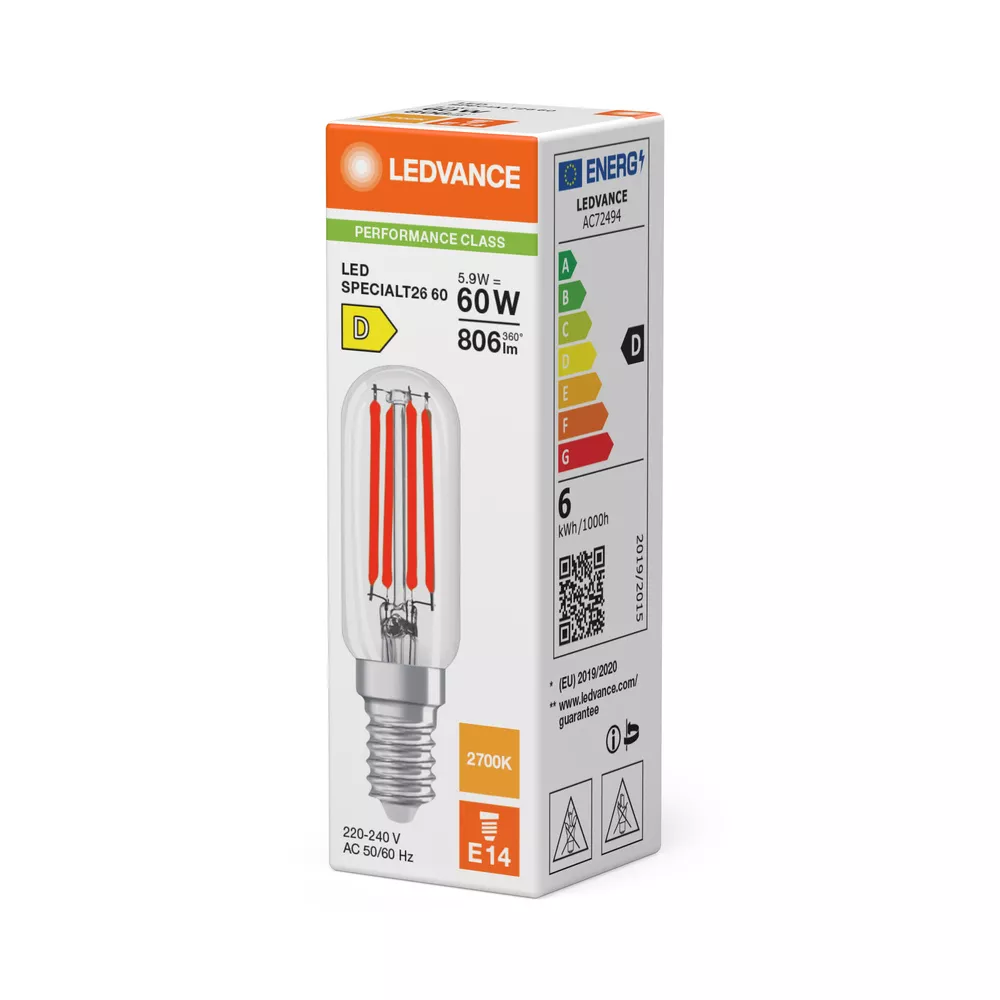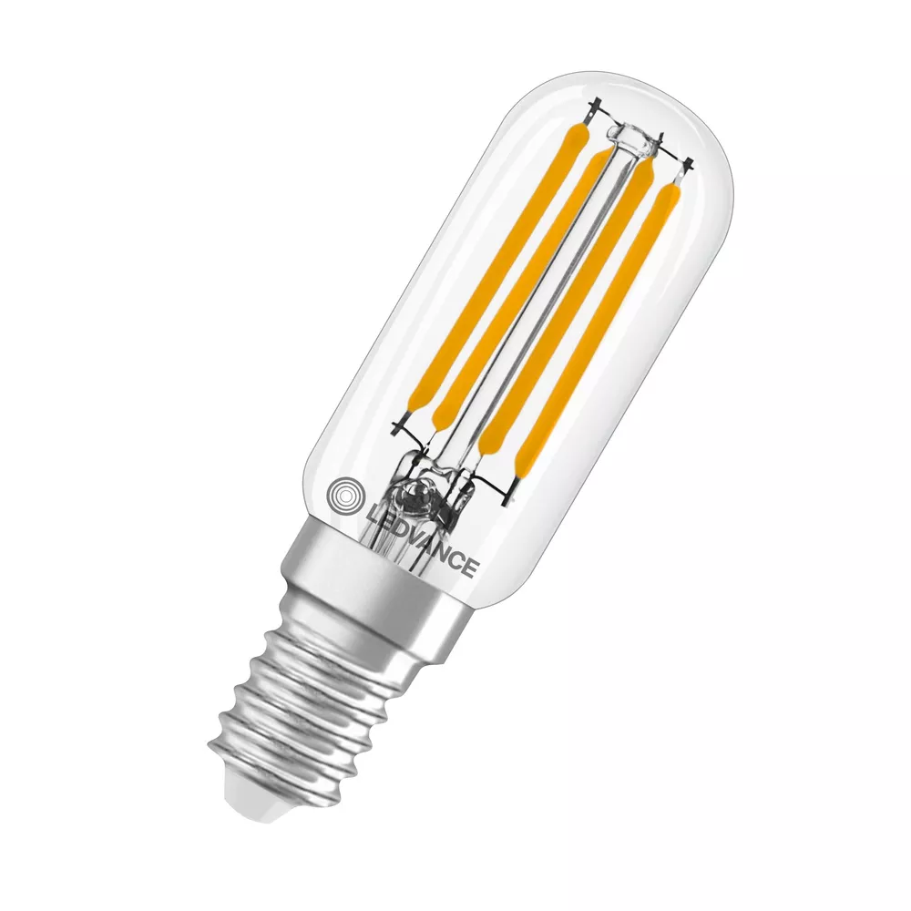 Specjalne lampy LED do lodówek. Cechy produktu: Zamienniki LED dla konwencjonalnych żarówek wysokonapięciowych. Dobra jakość światła, wskaźnik oddawania barw Ra: ≥ 80; stała chromatyczność. Zalety produktu: Wyjątkowo małe wymiary. Równomierny rozsył światła we wszystkich kierunkach. Idealne do zastosowania dekoracyjnego oraz do eksploatacji bez oprawy. Długa trwałość do 15 000 godzin. 4-letnia gwarancja. Niższe zużycie energii w porównaniu do lamp żarowych lub halogenowych. Obszary zastosowań: Małe oprawy designerskie. Zamrażarki domowe. Maszyny szwalnicze. Do użytku na zewnątrz tylko w odpowiednich oprawach zewnętrznych. Porady dotyczące bezpieczeństwa: Nie dotykaj lampy, jeśli jest stłuczona.. Nie wolno używać, jeśli zewnętrzne źródło światła jest uszkodzone..
