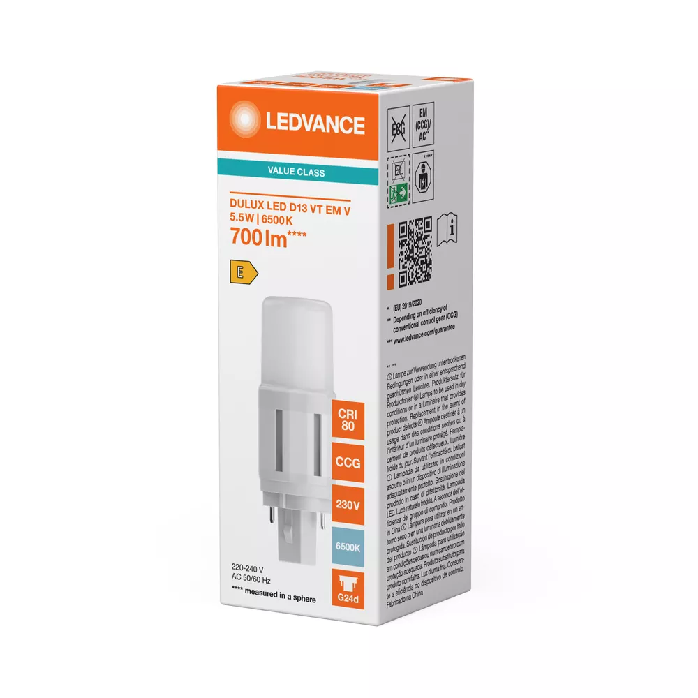 Zamiennik LED świetlówek jednotrzonkowych z 2-bolcowym trzonkiem G24d do zasilania przez statecznik magnetyczny lub bezpośrednio z sieci. Cechy produktu: Nadaje się tylko do zastosowań pionowych. Trwałość: do 30 000 h. Jednotrzonkowa, trzonek 2-kołkowy wtykowy G24d. Stopień ochrony: IP20. Lampy niezawierające rtęci. Zalety produktu: Łatwa instalacja. Niskie zużycie energii. Łatwa wymiana lamp dzięki kompaktowej konstrukcji. Możliwe bezpośrednie zasilanie z sieci 230 V AC. Obszary zastosowań: Oświetlenie ogólne – dla temperatur otoczenia w zakresie -20…+45 °C. Supermarkety i domy towarowe. Przejścia i korytarze. Hotele, restauracje. Porady dotyczące bezpieczeństwa: Nieodpowiednie do pracy w połączeniu szeregowym.. Zakres temperatury roboczej DULUX LED jest ograniczony. W przypadku wątpliwości co do przydatności aplikacji, przed instalacją należy zmierzyć temperaturę Tc na produkcie.. Wszystkie podłączenia elektryczne muszą być wykonane przez osobę wykwalifikowaną.. Nie nadaje się do oświetlenia awaryjnego.. Nie wolno używać, jeśli zewnętrzne źródło światła jest uszkodzone.. Nie dotykaj lampy, jeśli jest stłuczona..