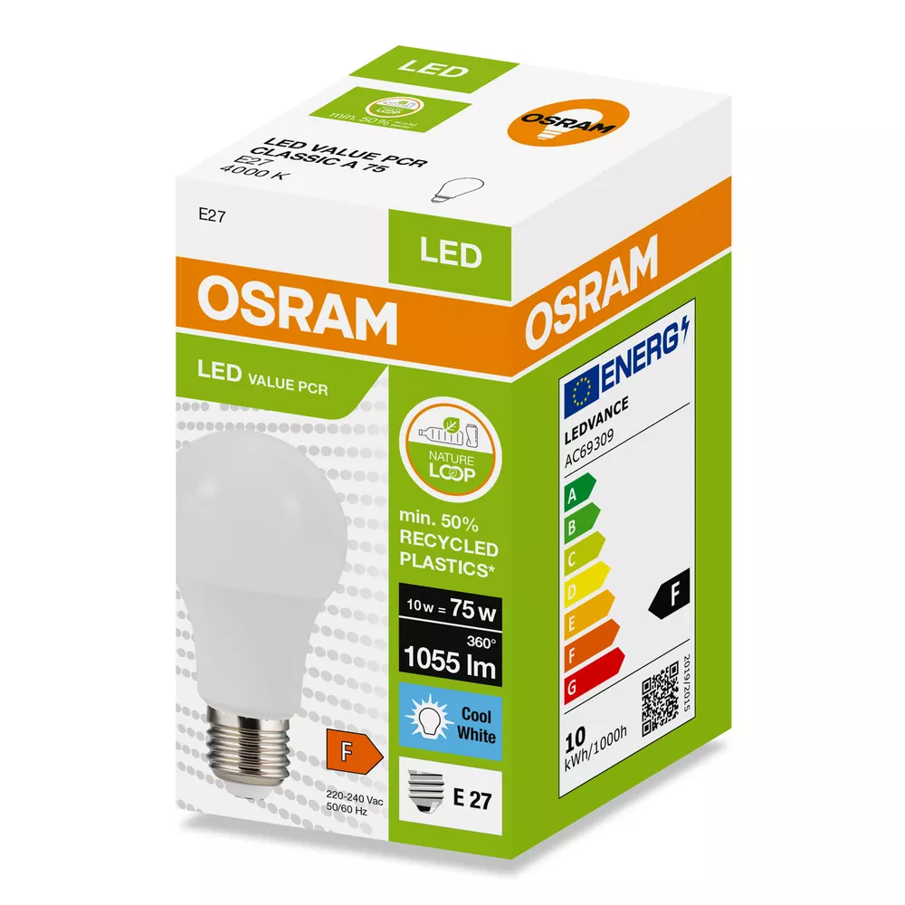 Lampy LED w kształcie klasycznej żarówki CLASSIC A, wykonana z przetworzonego plastiku. Cechy produktu: Profesjonalne lampy dla napięcia sieciowego. Brak możliwości regulacji strumienia świetlnego. Użyto co najmniej 50% plastiku pochodzącego z recyklingu (w stosunku do całkowitej masy plastiku). Trwałość do 15 000 h. Dobra jakość światła, wskaźnik oddawania barw Ra: ≥ 80; stała chromatyczność. Zalety produktu: Niższe zużycie energii w porównaniu do lamp żarowych lub halogenowych. Prosty w użyciu zamiennik żarówek klasycznych dzięki kompaktowej konstrukcji. Natychmiast 100 % światła, bez czasu nagrzewania. Wykonana z tworzyw sztucznych pochodzących z recyklingu lampa przyczynia się do ograniczenia emisji CO2 i ilości odpadów składowanych na wysypiskach. Obszary zastosowań: Zastosowania domowe. Oświetlenie ogólne. Do użytku na zewnątrz tylko w odpowiednich oprawach zewnętrznych. Porady dotyczące bezpieczeństwa: Nie dotykaj lampy, jeśli jest stłuczona.. Nie wolno używać, jeśli zewnętrzne źródło światła jest uszkodzone..