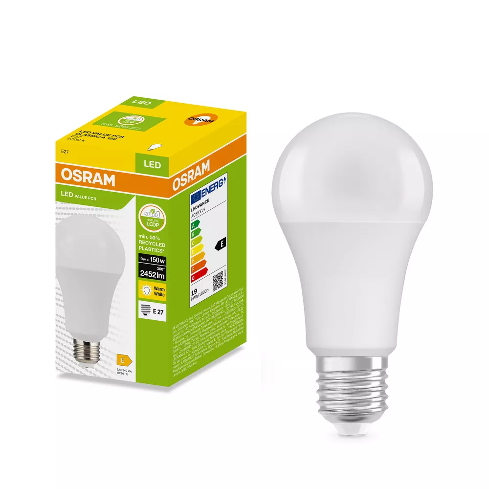 Lampy LED w kształcie klasycznej żarówki CLASSIC A, wykonana z przetworzonego plastiku. Cechy produktu: Profesjonalne lampy dla napięcia sieciowego. Brak możliwości regulacji strumienia świetlnego. Użyto co najmniej 50% plastiku pochodzącego z recyklingu (w stosunku do całkowitej masy plastiku). Trwałość do 15 000 h. Dobra jakość światła, wskaźnik oddawania barw Ra: ≥ 80; stała chromatyczność. Zalety produktu: Niższe zużycie energii w porównaniu do lamp żarowych lub halogenowych. Prosty w użyciu zamiennik żarówek klasycznych dzięki kompaktowej konstrukcji. Natychmiast 100 % światła, bez czasu nagrzewania. Wykonana z tworzyw sztucznych pochodzących z recyklingu lampa przyczynia się do ograniczenia emisji CO2 i ilości odpadów składowanych na wysypiskach. Obszary zastosowań: Zastosowania domowe. Oświetlenie ogólne. Do użytku na zewnątrz tylko w odpowiednich oprawach zewnętrznych. Porady dotyczące bezpieczeństwa: Nie dotykaj lampy, jeśli jest stłuczona.. Nie wolno używać, jeśli zewnętrzne źródło światła jest uszkodzone..