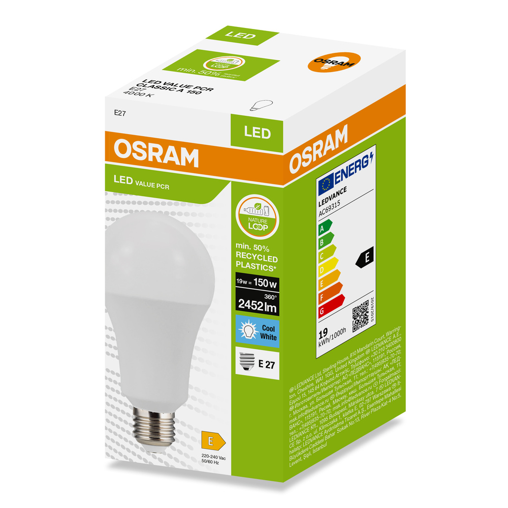 Lampy LED w kształcie klasycznej żarówki CLASSIC A, wykonana z przetworzonego plastiku. Cechy produktu: Profesjonalne lampy dla napięcia sieciowego. Brak możliwości regulacji strumienia świetlnego. Użyto co najmniej 50% plastiku pochodzącego z recyklingu (w stosunku do całkowitej masy plastiku). Trwałość do 15 000 h. Dobra jakość światła, wskaźnik oddawania barw Ra: ≥ 80; stała chromatyczność. Zalety produktu: Niższe zużycie energii w porównaniu do lamp żarowych lub halogenowych. Prosty w użyciu zamiennik żarówek klasycznych dzięki kompaktowej konstrukcji. Natychmiast 100 % światła, bez czasu nagrzewania. Wykonana z tworzyw sztucznych pochodzących z recyklingu lampa przyczynia się do ograniczenia emisji CO2 i ilości odpadów składowanych na wysypiskach. Obszary zastosowań: Zastosowania domowe. Oświetlenie ogólne. Do użytku na zewnątrz tylko w odpowiednich oprawach zewnętrznych. Porady dotyczące bezpieczeństwa: Nie dotykaj lampy, jeśli jest stłuczona.. Nie wolno używać, jeśli zewnętrzne źródło światła jest uszkodzone..