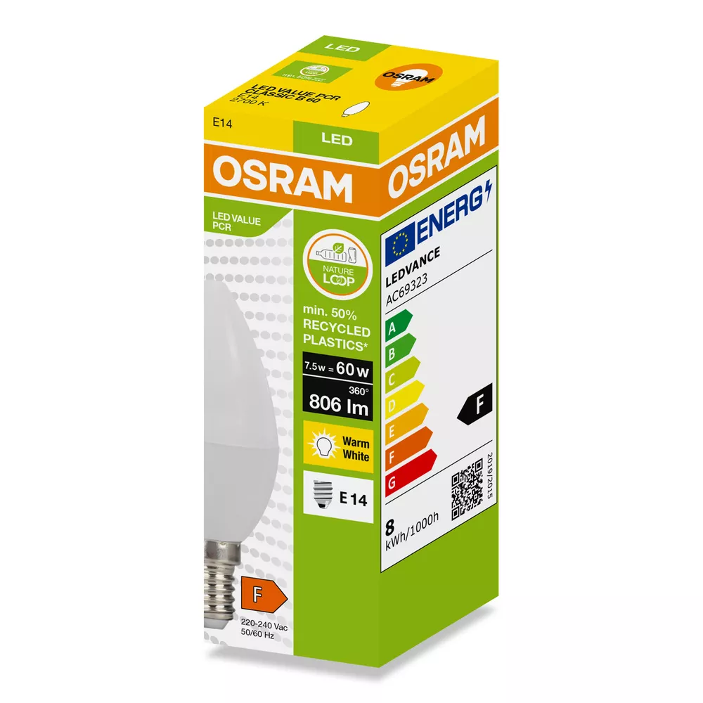 Lampy LED w kształcie klasycznej żarówki CLASSIC B wykonane z przetworzonego plastiku. Cechy produktu: Profesjonalne lampy dla napięcia sieciowego. Brak możliwości regulacji strumienia świetlnego. Użyto co najmniej 50% plastiku pochodzącego z recyklingu (w stosunku do całkowitej masy plastiku). Trwałość do 15 000 h. Dobra jakość światła, wskaźnik oddawania barw Ra: ≥ 80; stała chromatyczność. Zalety produktu: Niższe zużycie energii w porównaniu do lamp żarowych lub halogenowych. Prosty w użyciu zamiennik żarówek klasycznych dzięki kompaktowej konstrukcji. Natychmiast 100 % światła, bez czasu nagrzewania. Wykonana z tworzyw sztucznych pochodzących z recyklingu lampa przyczynia się do ograniczenia emisji CO2 i ilości odpadów składowanych na wysypiskach. Obszary zastosowań: Zastosowania domowe. Oświetlenie ogólne. Do użytku na zewnątrz tylko w odpowiednich oprawach zewnętrznych. Porady dotyczące bezpieczeństwa: Nie dotykaj lampy, jeśli jest stłuczona.. Nie wolno używać, jeśli zewnętrzne źródło światła jest uszkodzone..