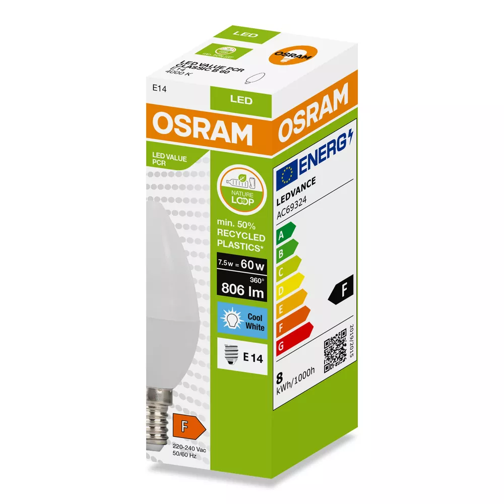 Lampy LED w kształcie klasycznej żarówki CLASSIC B wykonane z przetworzonego plastiku. Cechy produktu: Profesjonalne lampy dla napięcia sieciowego. Brak możliwości regulacji strumienia świetlnego. Użyto co najmniej 50% plastiku pochodzącego z recyklingu (w stosunku do całkowitej masy plastiku). Trwałość do 15 000 h. Dobra jakość światła, wskaźnik oddawania barw Ra: ≥ 80; stała chromatyczność. Zalety produktu: Niższe zużycie energii w porównaniu do lamp żarowych lub halogenowych. Prosty w użyciu zamiennik żarówek klasycznych dzięki kompaktowej konstrukcji. Natychmiast 100 % światła, bez czasu nagrzewania. Wykonana z tworzyw sztucznych pochodzących z recyklingu lampa przyczynia się do ograniczenia emisji CO2 i ilości odpadów składowanych na wysypiskach. Obszary zastosowań: Zastosowania domowe. Oświetlenie ogólne. Do użytku na zewnątrz tylko w odpowiednich oprawach zewnętrznych. Porady dotyczące bezpieczeństwa: Nie dotykaj lampy, jeśli jest stłuczona.. Nie wolno używać, jeśli zewnętrzne źródło światła jest uszkodzone..