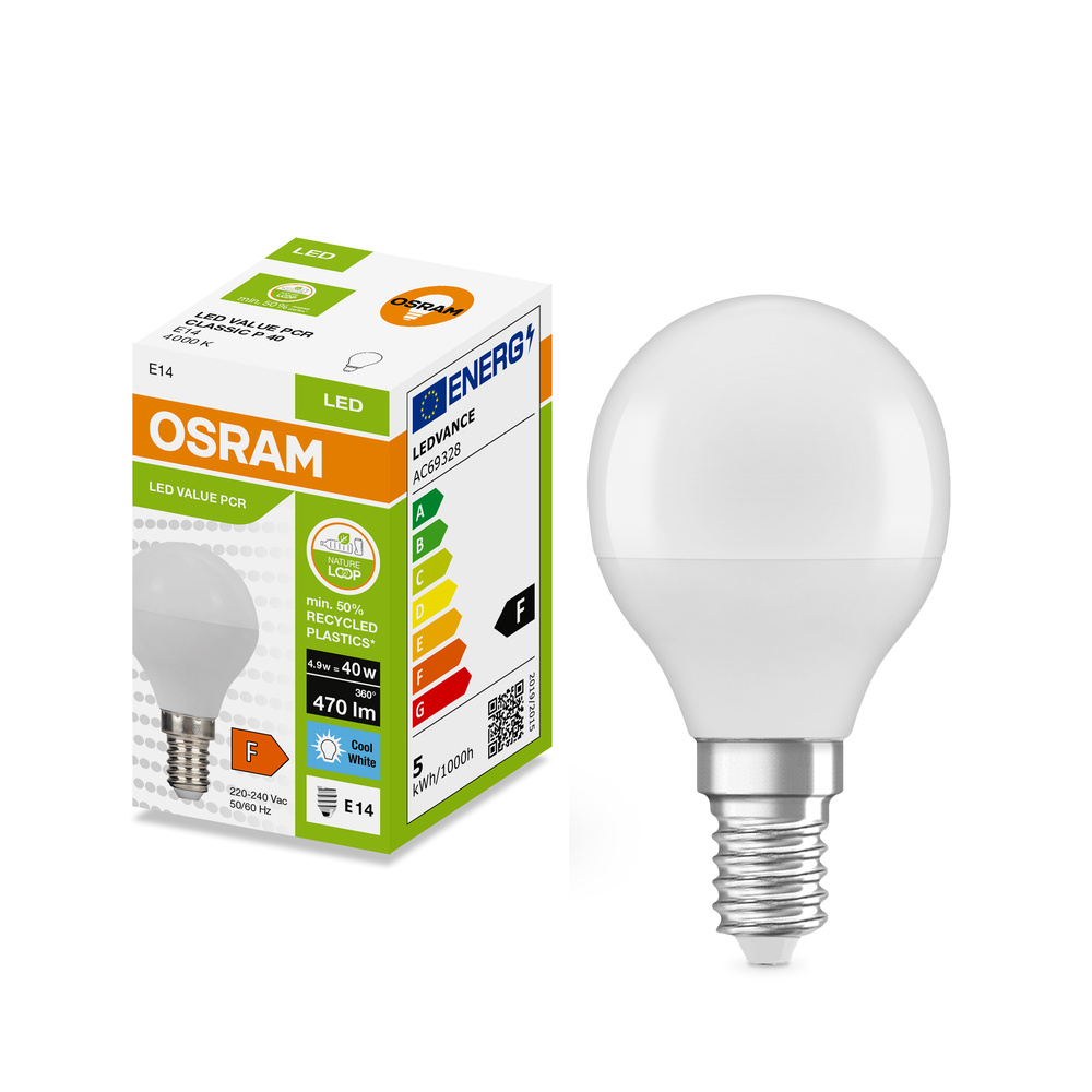 Lampy LED w kształcie LED CLASSIC P wykonane z przetworzonego plastiku. Cechy produktu: Profesjonalne lampy dla napięcia sieciowego. Brak możliwości regulacji strumienia świetlnego. Użyto co najmniej 50% plastiku pochodzącego z recyklingu (w stosunku do całkowitej masy plastiku). Trwałość do 15 000 h. Dobra jakość światła, wskaźnik oddawania barw Ra: ≥ 80; stała chromatyczność. Zalety produktu: Niższe zużycie energii w porównaniu do lamp żarowych lub halogenowych. Prosty w użyciu zamiennik żarówek klasycznych dzięki kompaktowej konstrukcji. Natychmiast 100 % światła, bez czasu nagrzewania. Wykonana z tworzyw sztucznych pochodzących z recyklingu lampa przyczynia się do ograniczenia emisji CO2 i ilości odpadów składowanych na wysypiskach. Obszary zastosowań: Zastosowania domowe. Oświetlenie ogólne. Do użytku na zewnątrz tylko w odpowiednich oprawach zewnętrznych. Porady dotyczące bezpieczeństwa: Nie dotykaj lampy, jeśli jest stłuczona.. Nie wolno używać, jeśli zewnętrzne źródło światła jest uszkodzone..