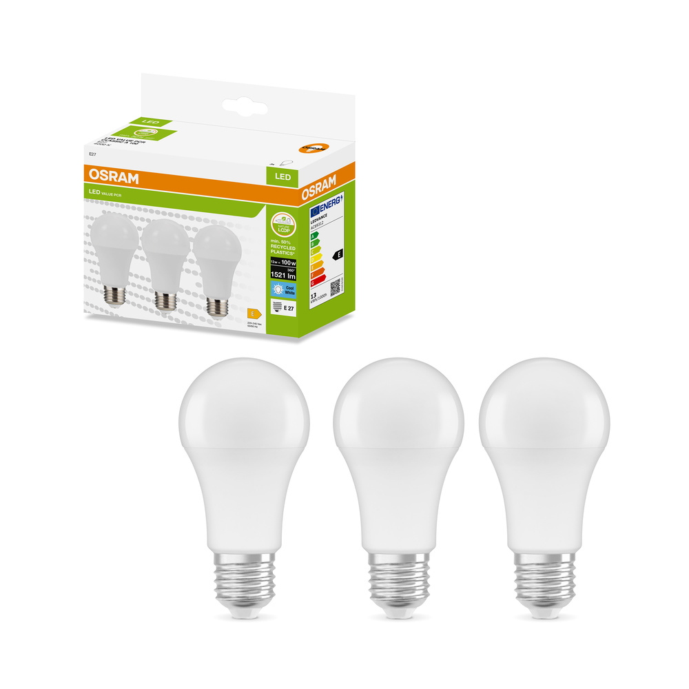 Lampy LED w kształcie klasycznej żarówki CLASSIC A, wykonana z przetworzonego plastiku. Cechy produktu: Profesjonalne lampy dla napięcia sieciowego. Brak możliwości regulacji strumienia świetlnego. Użyto co najmniej 50% plastiku pochodzącego z recyklingu (w stosunku do całkowitej masy plastiku). Trwałość do 15 000 h. Dobra jakość światła, wskaźnik oddawania barw Ra: ≥ 80; stała chromatyczność. Zalety produktu: Niższe zużycie energii w porównaniu do lamp żarowych lub halogenowych. Prosty w użyciu zamiennik żarówek klasycznych dzięki kompaktowej konstrukcji. Natychmiast 100 % światła, bez czasu nagrzewania. Wykonana z tworzyw sztucznych pochodzących z recyklingu lampa przyczynia się do ograniczenia emisji CO2 i ilości odpadów składowanych na wysypiskach. Obszary zastosowań: Zastosowania domowe. Oświetlenie ogólne. Do użytku na zewnątrz tylko w odpowiednich oprawach zewnętrznych. Porady dotyczące bezpieczeństwa: Nie dotykaj lampy, jeśli jest stłuczona.. Nie wolno używać, jeśli zewnętrzne źródło światła jest uszkodzone..