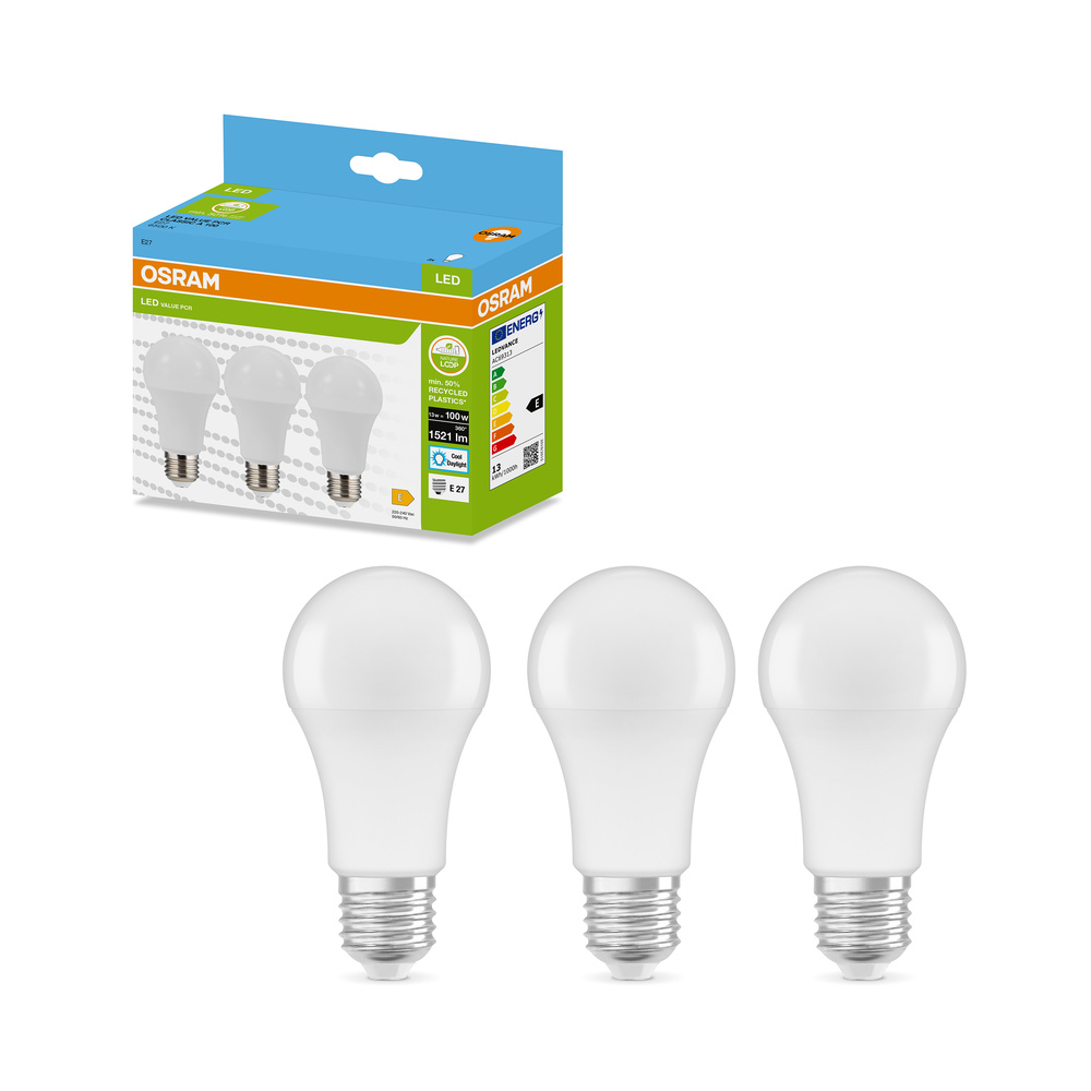 Lampy LED w kształcie klasycznej żarówki CLASSIC A, wykonana z przetworzonego plastiku. Cechy produktu: Profesjonalne lampy dla napięcia sieciowego. Brak możliwości regulacji strumienia świetlnego. Użyto co najmniej 50% plastiku pochodzącego z recyklingu (w stosunku do całkowitej masy plastiku). Trwałość do 15 000 h. Dobra jakość światła, wskaźnik oddawania barw Ra: ≥ 80; stała chromatyczność. Zalety produktu: Niższe zużycie energii w porównaniu do lamp żarowych lub halogenowych. Prosty w użyciu zamiennik żarówek klasycznych dzięki kompaktowej konstrukcji. Natychmiast 100 % światła, bez czasu nagrzewania. Wykonana z tworzyw sztucznych pochodzących z recyklingu lampa przyczynia się do ograniczenia emisji CO2 i ilości odpadów składowanych na wysypiskach. Obszary zastosowań: Zastosowania domowe. Oświetlenie ogólne. Do użytku na zewnątrz tylko w odpowiednich oprawach zewnętrznych. Porady dotyczące bezpieczeństwa: Nie dotykaj lampy, jeśli jest stłuczona.. Nie wolno używać, jeśli zewnętrzne źródło światła jest uszkodzone..