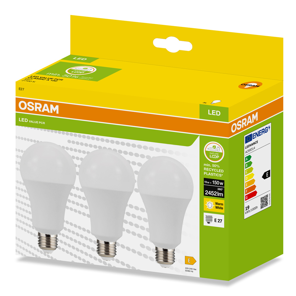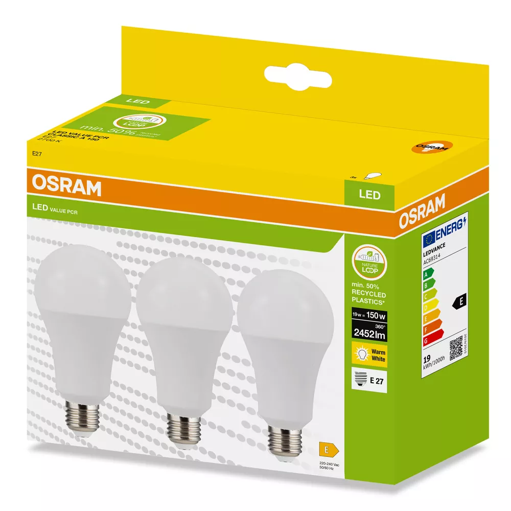 Lampy LED w kształcie klasycznej żarówki CLASSIC A, wykonana z przetworzonego plastiku. Cechy produktu: Profesjonalne lampy dla napięcia sieciowego. Brak możliwości regulacji strumienia świetlnego. Użyto co najmniej 50% plastiku pochodzącego z recyklingu (w stosunku do całkowitej masy plastiku). Trwałość do 15 000 h. Dobra jakość światła, wskaźnik oddawania barw Ra: ≥ 80; stała chromatyczność. Zalety produktu: Niższe zużycie energii w porównaniu do lamp żarowych lub halogenowych. Prosty w użyciu zamiennik żarówek klasycznych dzięki kompaktowej konstrukcji. Natychmiast 100 % światła, bez czasu nagrzewania. Wykonana z tworzyw sztucznych pochodzących z recyklingu lampa przyczynia się do ograniczenia emisji CO2 i ilości odpadów składowanych na wysypiskach. Obszary zastosowań: Zastosowania domowe. Oświetlenie ogólne. Do użytku na zewnątrz tylko w odpowiednich oprawach zewnętrznych. Porady dotyczące bezpieczeństwa: Nie dotykaj lampy, jeśli jest stłuczona.. Nie wolno używać, jeśli zewnętrzne źródło światła jest uszkodzone..