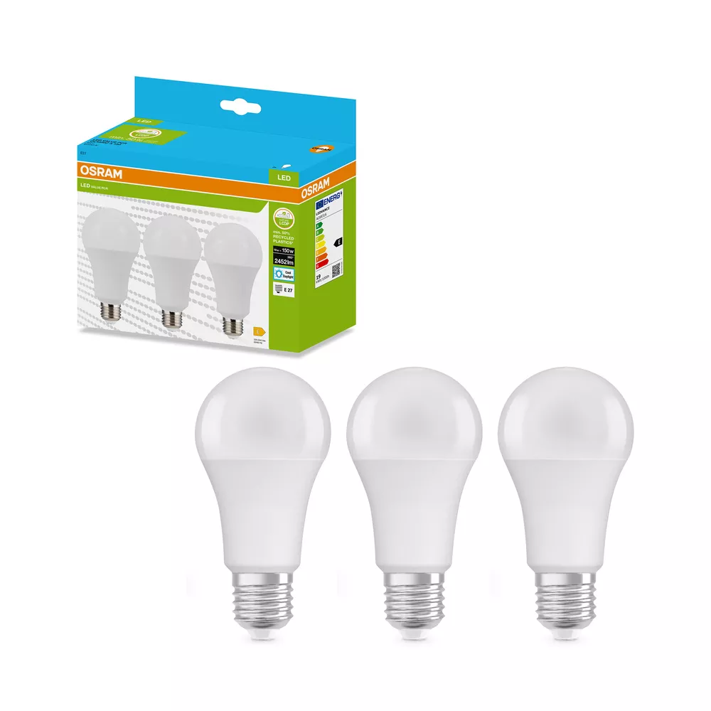 Lampy LED w kształcie klasycznej żarówki CLASSIC A, wykonana z przetworzonego plastiku. Cechy produktu: Profesjonalne lampy dla napięcia sieciowego. Brak możliwości regulacji strumienia świetlnego. Użyto co najmniej 50% plastiku pochodzącego z recyklingu (w stosunku do całkowitej masy plastiku). Trwałość do 15 000 h. Dobra jakość światła, wskaźnik oddawania barw Ra: ≥ 80; stała chromatyczność. Zalety produktu: Niższe zużycie energii w porównaniu do lamp żarowych lub halogenowych. Prosty w użyciu zamiennik żarówek klasycznych dzięki kompaktowej konstrukcji. Natychmiast 100 % światła, bez czasu nagrzewania. Wykonana z tworzyw sztucznych pochodzących z recyklingu lampa przyczynia się do ograniczenia emisji CO2 i ilości odpadów składowanych na wysypiskach. Obszary zastosowań: Zastosowania domowe. Oświetlenie ogólne. Do użytku na zewnątrz tylko w odpowiednich oprawach zewnętrznych. Porady dotyczące bezpieczeństwa: Nie dotykaj lampy, jeśli jest stłuczona.. Nie wolno używać, jeśli zewnętrzne źródło światła jest uszkodzone..